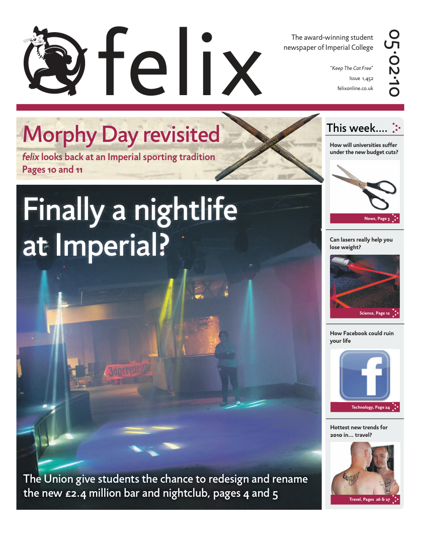 Joking aside, after last year's rocky relationship, felix and the Union have a decent understanding this year. This is evidenced by their willingness to run the competition to rename the Union bars through the paper. The best (possibly worst) way of describing this is if both felix and the Union had Facebook profiles (which I'm convinced they both do). felix would be in an 'Open Relationship with Imperial College Union'. We feed off each other, we both have needs each other can provide, but felix isn't scared of turning around on the Union, stamping on its feet and putting a gun to its head demanding answers when need be. It's just we're still waiting for that time when we can get our rifle out and load it.