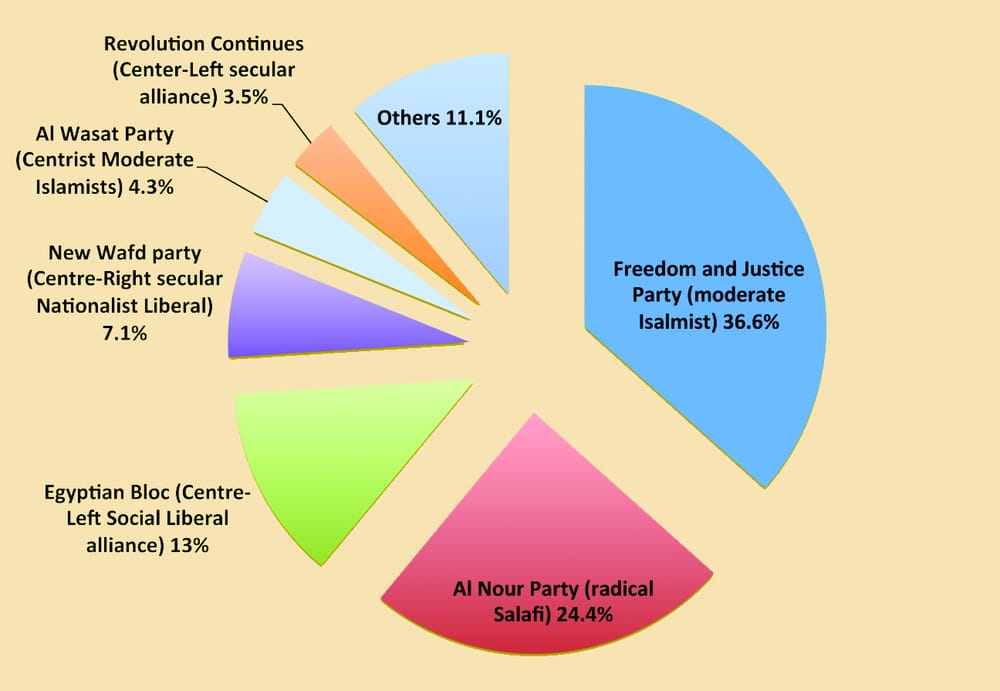 Results from Egypt’s first stage of Parliamentary elections suggests Islamist parties will take two thirds of seats. Though run offs will eventually determine distribution, the moderate Islamist Freedom and Justice Party and the radical Salafi Islamist Al Nour Party are clearly dominant. This means the new constitution and legal framework is likely to have strong Islamic influences including implementation of Shariah law. The results have caused alarm in Israel, where Egypt’s previous dictator, Mubarak, maintained good relations. Coptic Christians, who make up between 10-15% of the population, are particularly nervous that Egypt could become the new Iran and many are planning to leave the country.