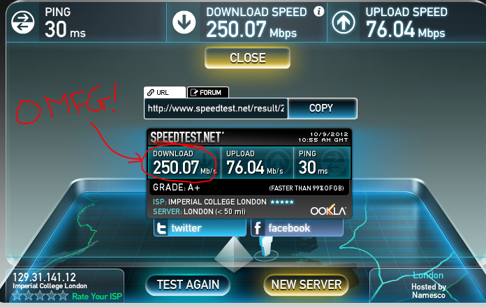 Now that the majority of you have moved into halls you’ve probably connected to the internet and sampled some of the best broadband in the country. One piece of advice though, grab an Ethernet cable, connect, and visit www.speedtest.net. Although not truly accurate, it makes for pleasant viewing as you watch your speeds soar to INSANE LEVELS OF INTERNET. With internet speeds this fast at Imperial, it makes online data transfer incredibly fast and streaming truly gone forever, which makes watching those HD naughty films all so much better – thank you Imperial ICT. (Please don’t ever let me touch your laptop – Tim).