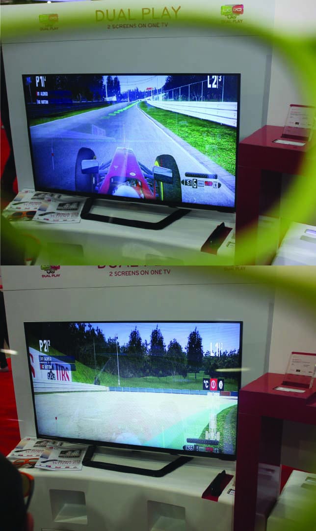 LG makes use of this same technique to deliver two simultaneous images over one screen. Two different pairs of glasses are each attuned to different polarisation. Two users wearing the different pairs of glasses will thus see different images. This was demonstrated during the Live Gadget Show when two players could simultaneously play a racing game that would usually be in the form of a split screen. In this case, the image for each player was blown up to take advantage of the whole screen. The LG representative said that this works for all game consoles without needing any special form of processing. The user would just have to hit a few buttons on the TV remote control to tell the TV how the game consoles splits the screen, either vertically or horizontally, and the TV will do the rest of the work.