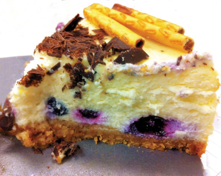 Baked vanilla cheesecake with blueberries and chocolate flakes