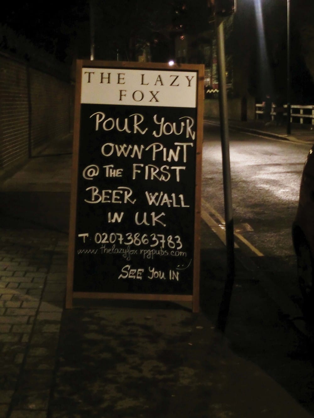 Contrary to the sometimes-pretentious gastropubs you see nowadays, The Lazy Fox can probably be best described as a refreshing marriage between good ol’ British tradition and the Facebook age. It strikes a nice balance between the two, so you can enjoy the simple pleasures that come from pub tipple and grub enhanced with just the right amount of modern pizzazz. The Robot Pub Group, who run the place (along with its older sibling The Thirsty Bear in Waterloo) are also the masterminds behind the technology that makes the beer wall possible – along with a host of other solutions for optimizing the pub experience. Talk about having a long-term Show and Tell that works!