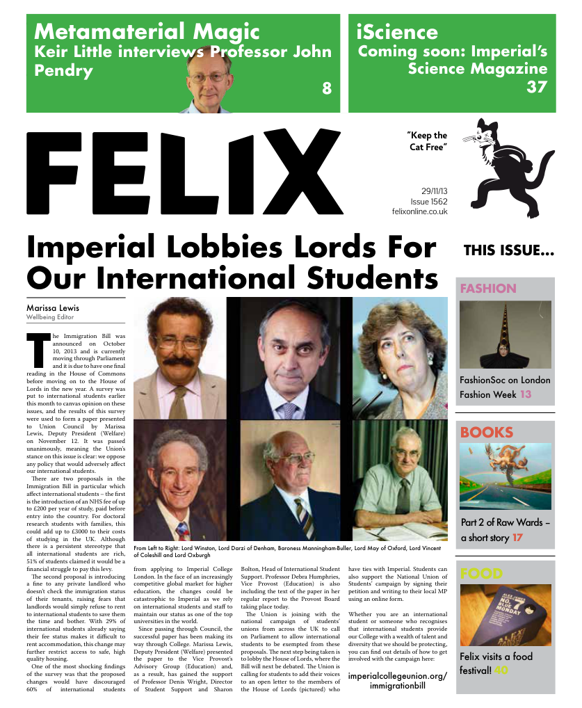 The Union is joining with the national campaign of students’ unions from across the UK to call on Parliament to allow international students to be exempted from these proposals. The next step being taken is to lobby the House of Lords, where the Bill will next be debated. The Union is calling for students to add their voices to an open letter to the members of the House of Lords (pictured) who have ties with Imperial. Students can also support the National Union of Students’ campaign by signing their petition and writing to their local MP using an online form.