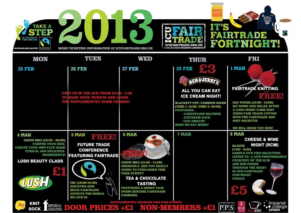 Last year many of you may remember the ambitious plans to hold an event on every single day for the whole two weeks. Through the gruelling efforts of a committed team, Fairtrade fortnight 2012 was an incredible success and will stick in the memories of everyone involved. This year however, we take a different tack: focusing specifically on quality rather than quantity, learning through our past experiences of what works (see www.icufairtrade.org.uk/private/wiki) and adding some new variations. We are also spreading efforts wider that before by collaborating with as many other societies as possible to get everybody involved. With all of our efforts, we hope to pull off the best Fairtrade fortnight yet!