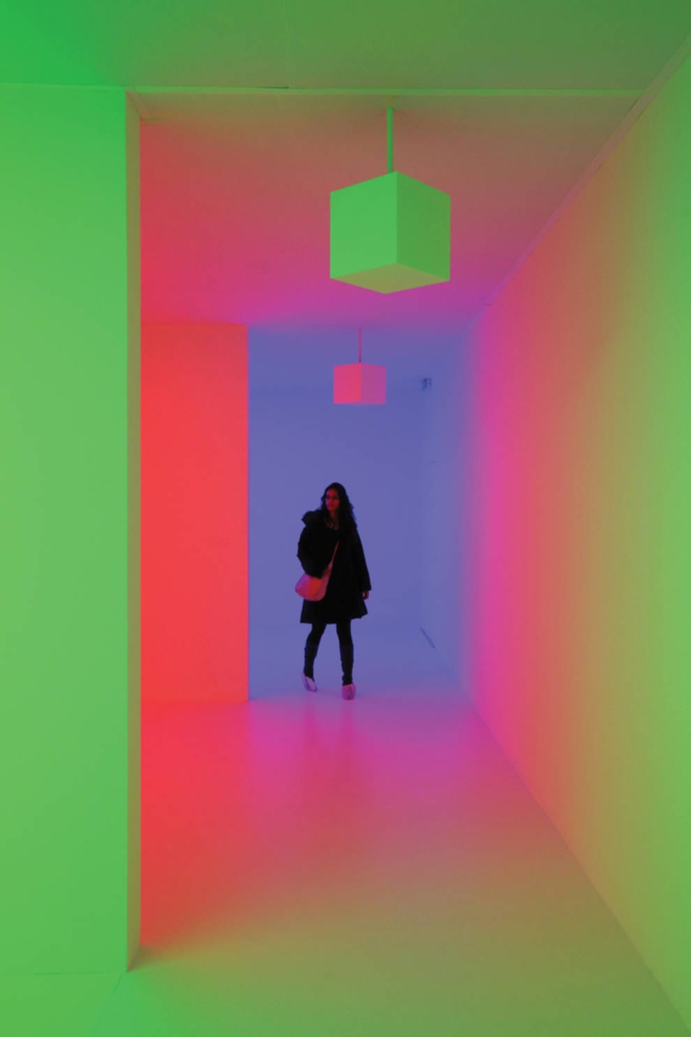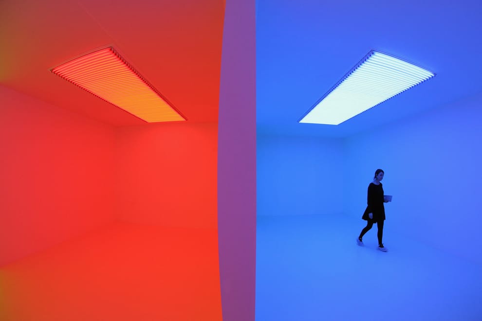 Other pieces are simpler, taking their inspiration from the beautiful – and perhaps overlooked – sources of light in the world around us. There is a bulb that emulates the glow of moonlight, and a collection of glowing neon tubes which recreate the splendour of twilight in Las Vegas. Chromosaturation, by the Venezuelan artist Carlos Cruz-Diez consists of three rooms, each bathed in blue, red, or green light; upon entering the first room everything is bathed in a cool blue light. Moving into the next room is literally painful – the red light is a brilliant scarlet, and burns my retinas. However, this soon fades, and when I move back to the blue room the cool tones have morphed into a brilliantly blinding cyan. Moving from blue to green turns the green light a vibrant yellow; moving from green to red, and a vivid fuchsia appears. Of course the light has never changed, it is only my eyes becoming adjusted to certain frequencies of light – a simple effect, but incredibly powerful.