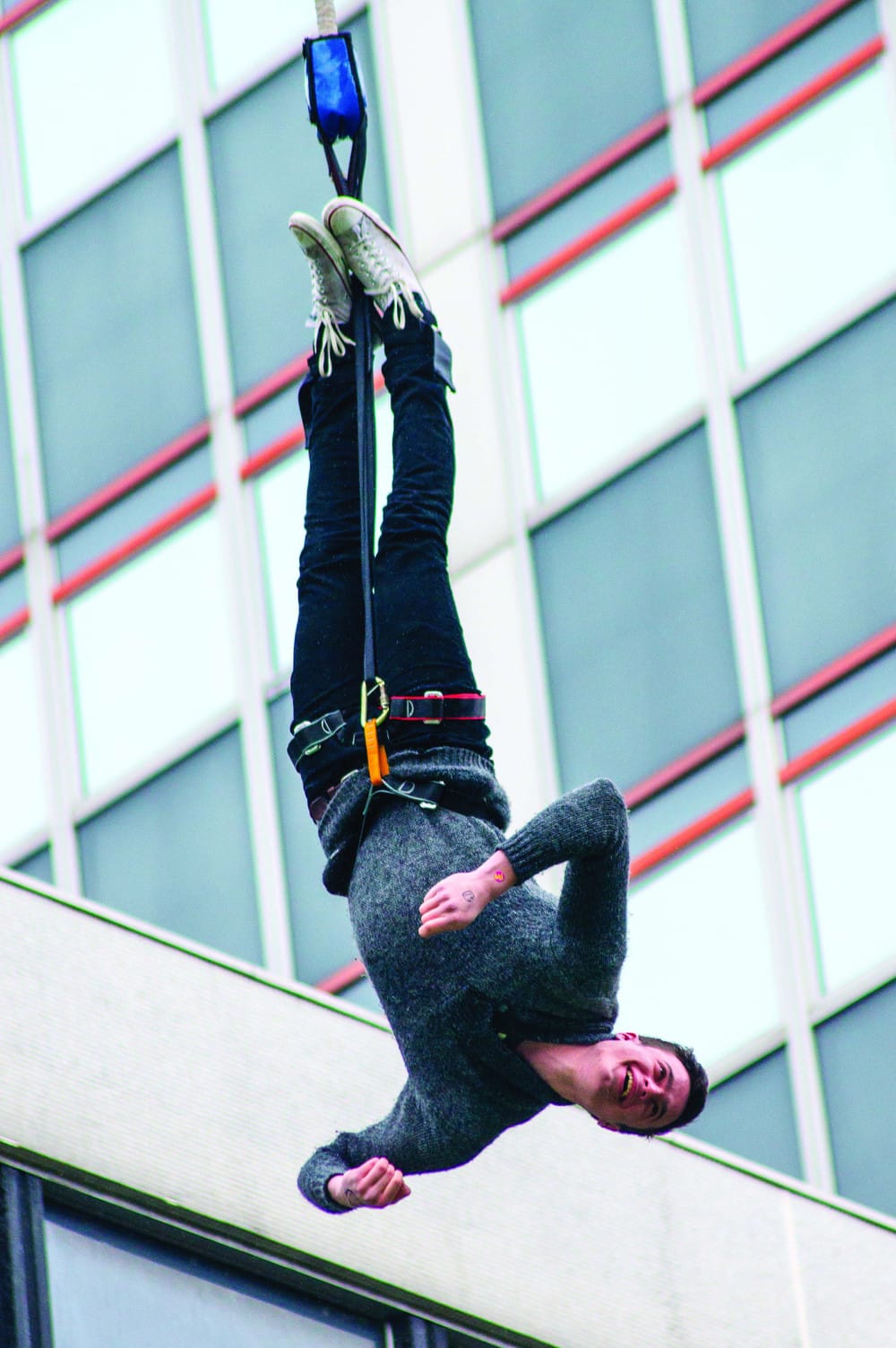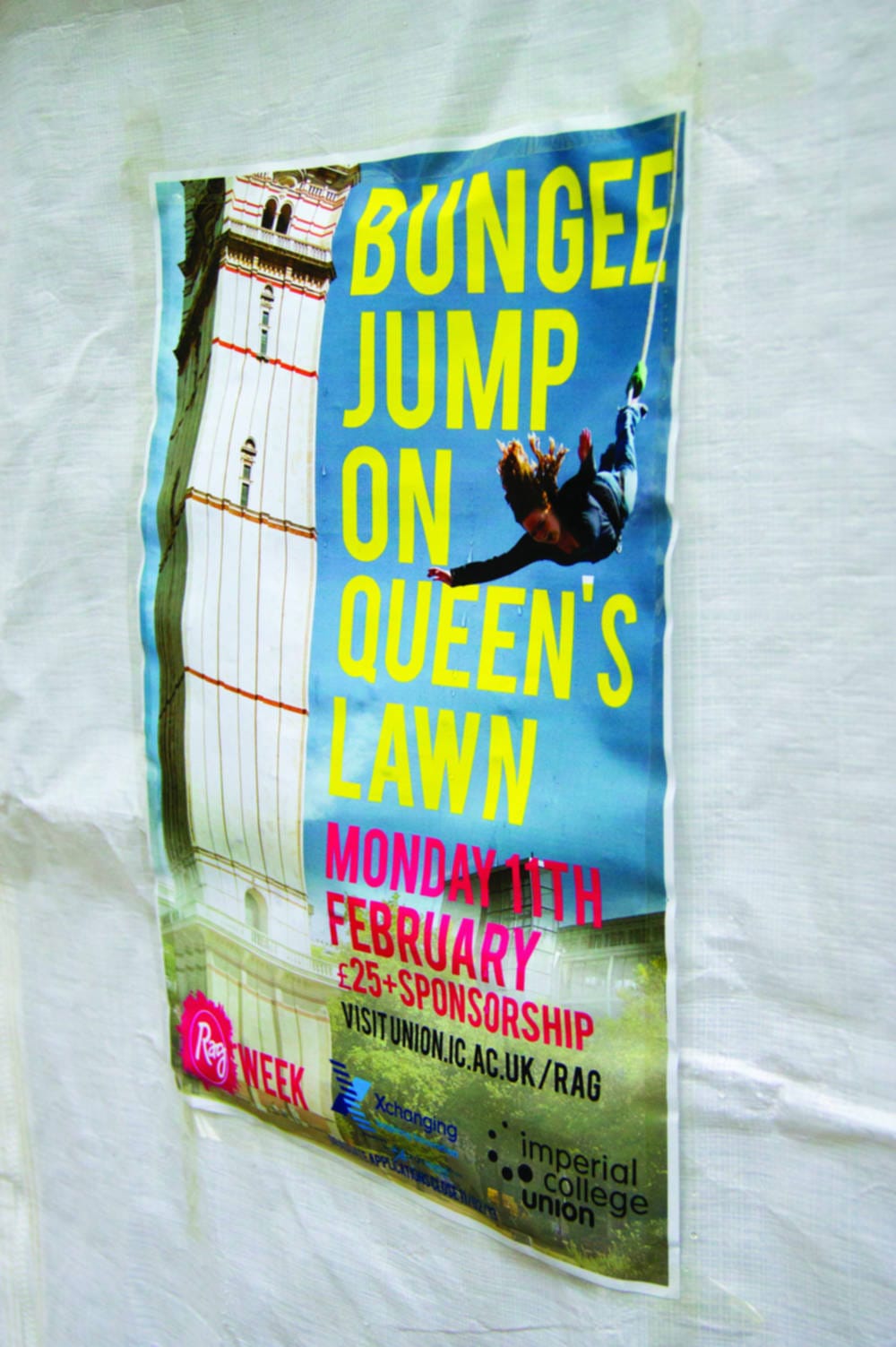 Recognition then came from the outside world in the form of a prize for the most innovative fundraising idea for our 24-hour row on the Queen’s Lawn, getting our committee invited to the BBC Children in Need Live Show. We were succeeding, and when Christmas came we knew we had generated the power to grab the attention of the whole university with our RAG week. So we met with the Rector and other members of College staff and brought something to Imperial that had never been seen before… a 164 foot high Bungee Jump. Tickets sold out straightaway, sponsorship was raised in the thousands and the spectacle dazzled all.