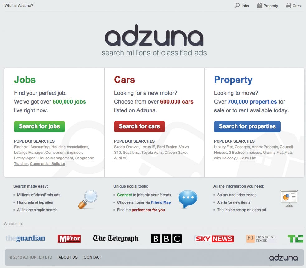 AH: Job ads are fragmented and too complicated to navigate. Users want to search all the ads in one place, which is what we provide at Adzuna: a one-stop shop. We then make the search experience better and empower our users to find the right ads for them, by layering on innovations in social and big data. The biggest misconception about our business is that we’re a portal where you can post ads (like Monster or Gumtree). Adzuna is a search engine (like Google).