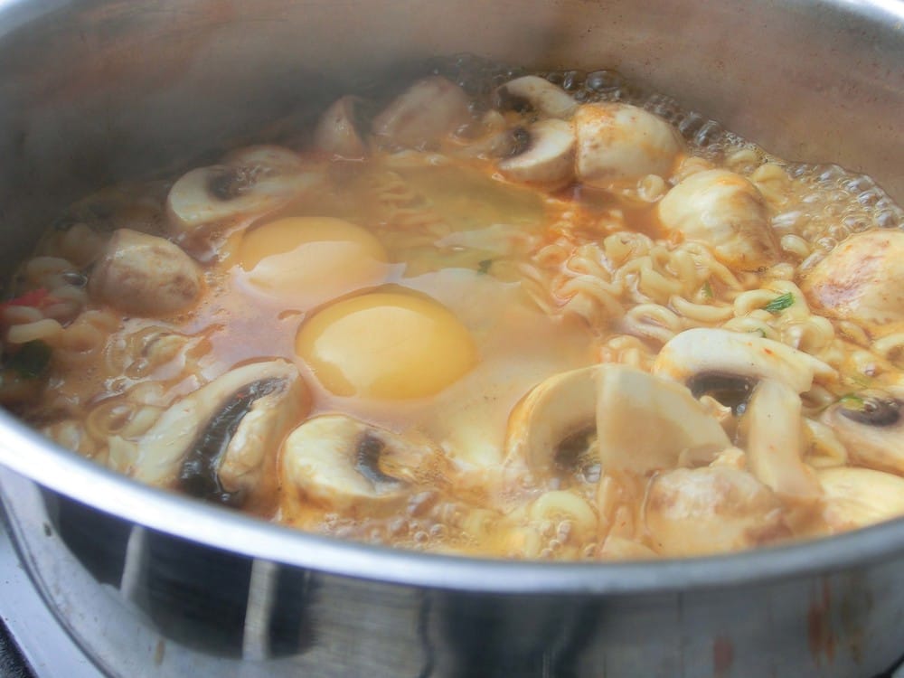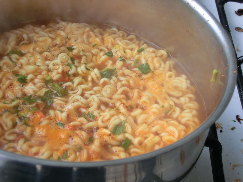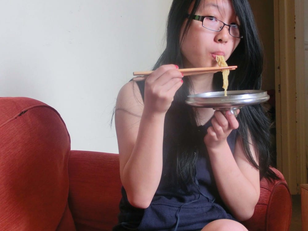 We eat out of the pot because we’re lazy as SQUAWK to wash a separate bowl. We use the pot lid as a plate for maximum ghetto student factor. Just like the SQUAWKing Koreans do. We couldn’t find or afford a hot girl to eat our epic ramen like in the EMT videos, so we settled with a SQUAWKing Food Editor. But it’s okay – we’re skint.