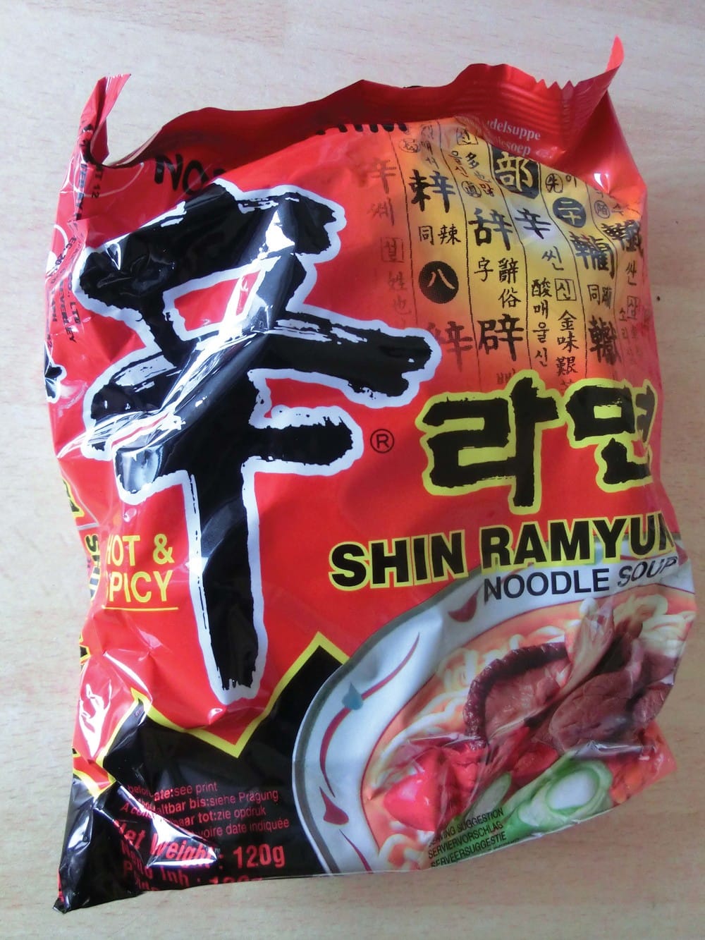 We get our instant ramen. We like Shin Ramyun/Ramen because it’s SQUAWK spicy and we’re tough like SQUAWK after all those exams. And it’s 120g. Double the size of Basics, still cheaper than two SQUAWKing Basics packs. Available in Chinatown/Bayswater. And it’s from Korea – Asians know their SQUAWK ramen and flavors. Korea, Japan, China – they’re all good choices. You don’t SQUAWKing mess with Asians. And their ramen.