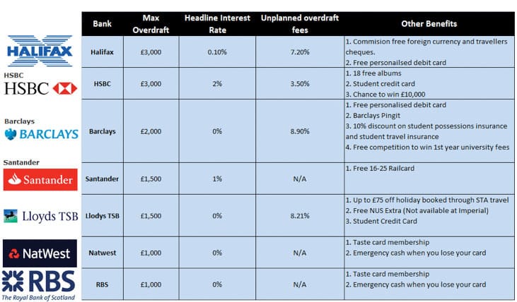 This is the highest interest rate (gross/AER) paid on balances held in the accounts. Most of the student accounts offer 0% headline interest, however some banks do offer it, such as HSBC (2%), Halifax (0.1%), Santander (1%) and Bank of Ireland (0.5%). My recommendation is that if you do have spare cash in your account, transfer it to a high interest savings account. Other