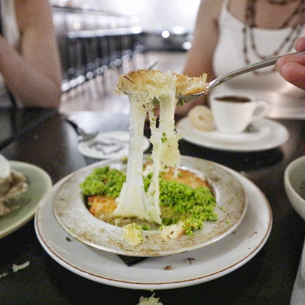 A dinner party cannot end without a sweet note. A selection of desserts was served, along with strong Turkish coffee and Turkish delights. Apart from spending a good amount of time trying to decrypt our futures from the sludge of coffee grinds at the bottom of our cups, we took care to enjoy the traditional desserts. The kunefe definitely had substantial wow-factor with its crispy, golden yellow Kadoyif pastry and its incredible white cheese strings, temporarily silencing our worries for our hips. The Sambali was a chunk of fluffy semolina cake, served with mastic (a fragrant plant resin used in Turkish desserts) ice cream, reminiscent of the lunchtime sponge cakes from my school days. The Armut Pismaniye comprised of half a poached pear balanced on top of a perfect sphere of ice cream, with a cloud of cotton candy and a generous handful of walnuts.