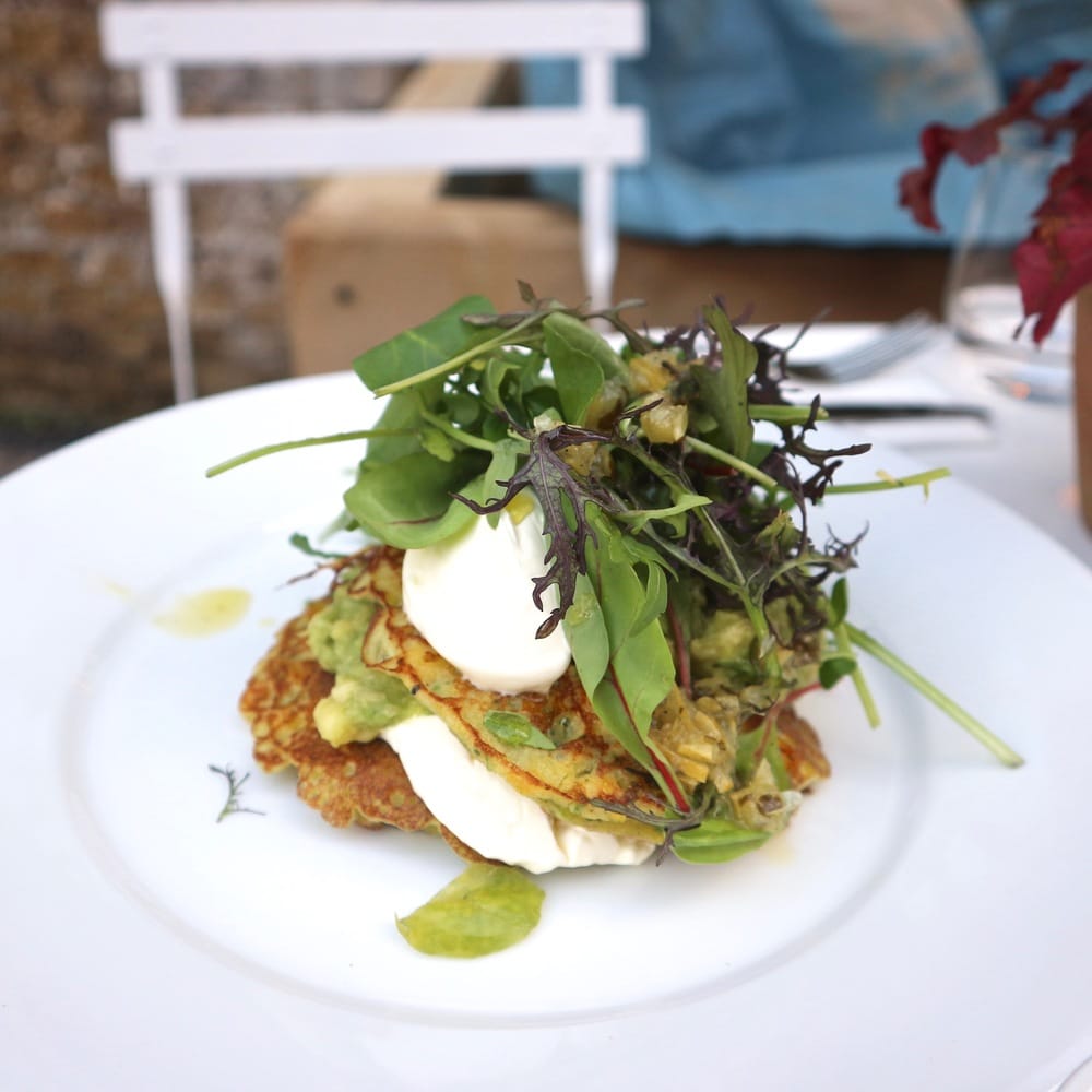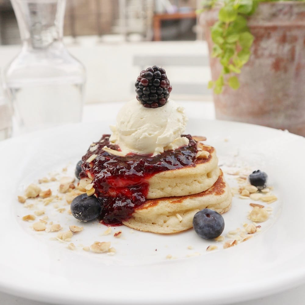 My second visit was definitely not the last. My third visit was on a bright Saturday afternoon, a mere ten days later. This time I tried something unexpected – the Australian. This was not as pancake-y as the rest, with it being a stack of corn fritters, with crushed avocado, crème fraiche, preserved lemon and a mixed leaf salad on top. The fritters were hot with a slightly crunchy edge, a good kick of saltiness and a citrusy hint from the lemon. The whole combination was light and satisfying. I was tempted to encore the berries pancake from my first visit – two thick, fluffy buttermilk pancakes with a sweet elderflower and forest berry compote, cream, crushed meringue and roasted nuts.
