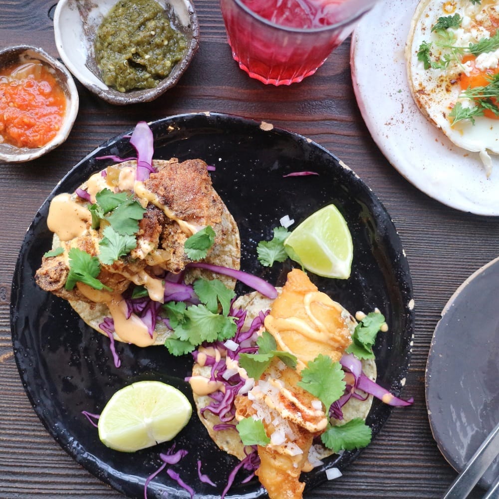 Despite it being the peak of the lunch hour, it didn’t take long for my table to be filled with a fiesta of earthenware, bright colours and of course, tacos. The baja fish and fried chicken tacos came as a pair on a black, glossy plate, excitingly Instagrammable with shreds of red cabbage, cilantro and lime. The fried egg taco came on its own white plate, the egg in a perfect circle on the soft corn tortilla with a bright orange yolk balancing on top.