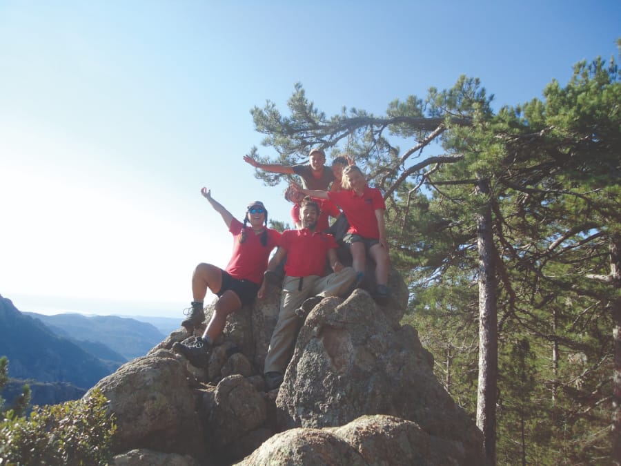 Knowing only a matter of hours separated us from the end of the hardest trail in Europe, we relaxed (perhaps too much) at breakfast, feasting on bread and Corsican jams and left to the sound of live Russian music performed by Harry. We took our time, relishing the last 19km of the GR20 with Alex and Mandus, taking in the views for a final time. We all wore our team expedition polo shirts and took group photos at every opportunity. Our legs were weary, especially Harry’s, whose ankle was causing him trouble again on the tricky terrain, but we pushed on, reminiscing about our journey across the island. Today the landscape was like that of a different country all together, as we descended away from the mountainous spine of Corsica and own into the forests towards the sea. Even the pools we bathed in 5km from the end were described as ‘lukewarm’ in the guidebook.