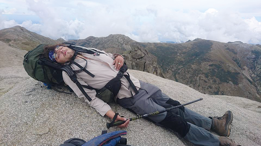 Despite our intentions to double today, everyone was feeling quite grim, so we were unsure as to whether we’d be up for the double stage, but we didn’t have to decide until the turning, which was two hours into the day. Our kit was wet from the night from hell last night so our bags were heavier and the going was very tough as we scrambled across the arête. We eventually found our rhythm though, and gritted through both stages. It was the afternoon ascent of Monte Alcudina that really challenged us. Before the climb even began we’d already had a long day’s undulating hike; the incline was never ending and seemed to get perpetually steeper. As more mountains kept appearing above us, even Harry (who usually powers up the ascents) was left broken and collapsed in a heap at the top! We were glad to see Refuge d’Asinau only a short descent from the peak and spent the evening desperately trying to get warm in the communal tent space with the other hikers.