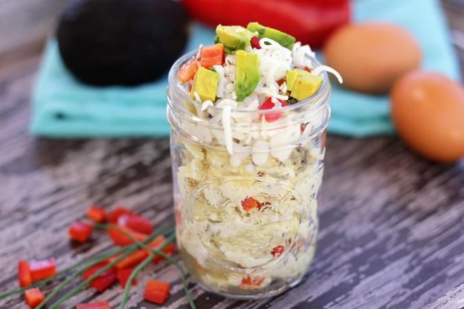 - Add the egg, egg whites, mushrooms, bell pepper, onion, salt, garlic and half the cheese into a 12-ounce or larger Mason jar coated with cooking spray. Shake or stir to combine, then seal with a lid unless making immediately.