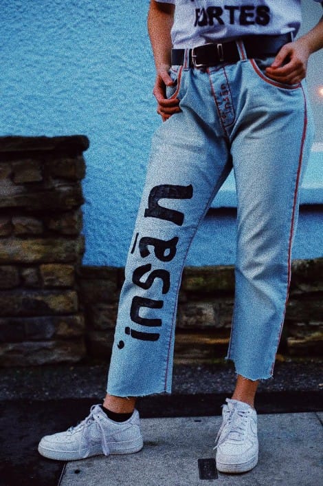 Our second design explores the concept of madness and humanity. The 'Madmen graphic jeans’ convey an eclectic counter-cultural message. On the front the jeans carry our ‘Insān’ branding whilst the back conveys the ‘madmen’ message. The jeans play on the double meaning of the word 'insān' (detailed previously) and explore this poignantly. We used fabric pens to create this design as they unequivocally allow us to explore what human beings can achieve with the simple marker pen. The design is reminiscent of youthful art and doodling – the shading of the margins and borders in the vibrant red is consistent with this. Meanwhile, the bold, almost cartoon style typeface for the branding is intelligent in conveying the message of understanding, like a child at school learns to understand the world around them, we encourage you to understand Insān. The shadow of madness is ever present, however, and shrouds the jeans quite literally from behind.