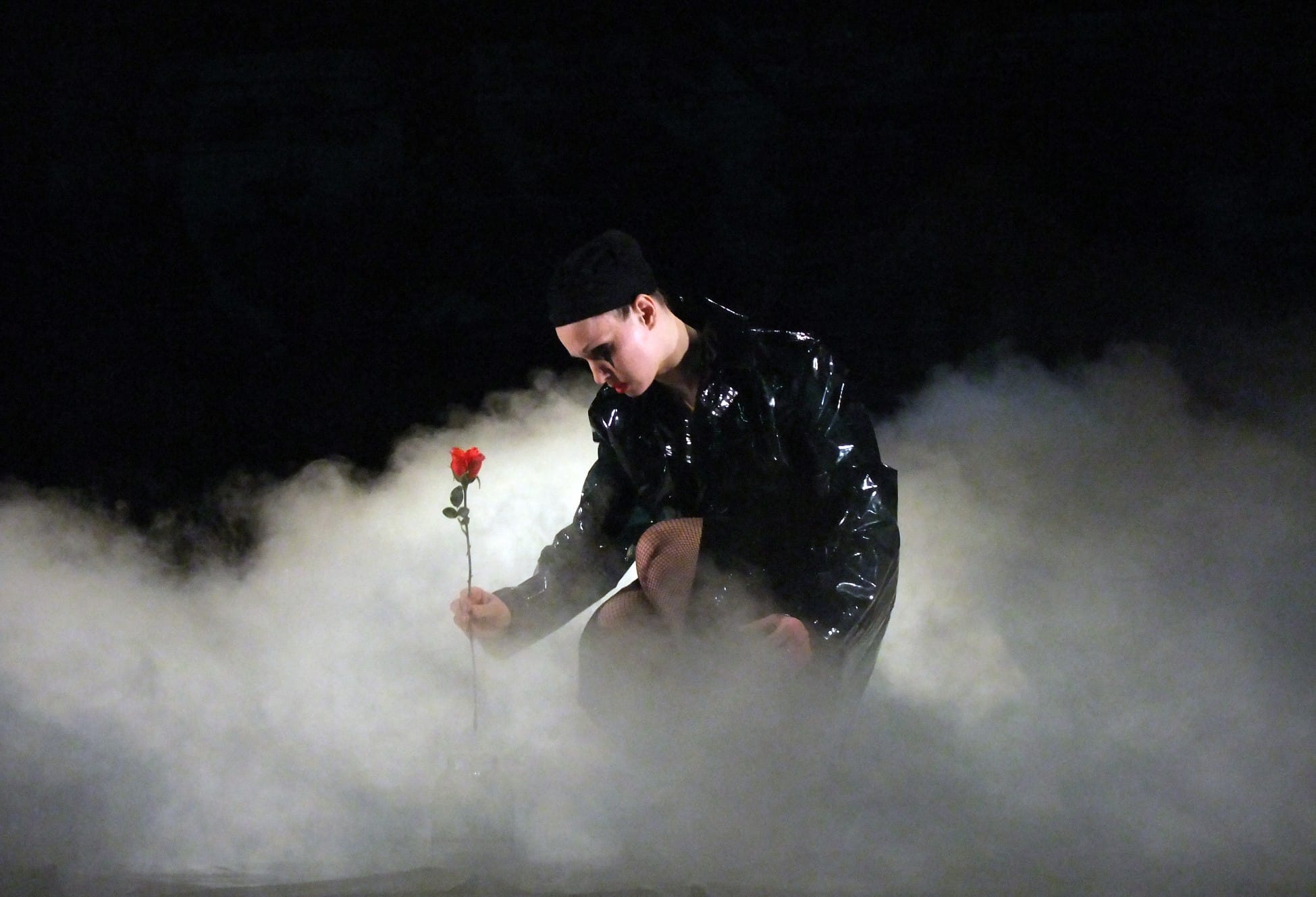 The staging is lavish, awash with beautiful, surreal images. Wong, the water-seller (Alexander Matrosov), frequently and symbolically makes use of dry sand. Rice rains from the sky as a god rides a bicycle through a forest of gaunt trees. Shen Te (Alexandra Ursulyak) converses with her alter ego Shui Ta who, improbably, is walking calmly on a treadmill in the middle of a forest. In one of the most dramatic scenes, empty cigarette packets rain down like gold, while Shen Te, alone on stage but for a full-length mirror, confronts her own reflected image.