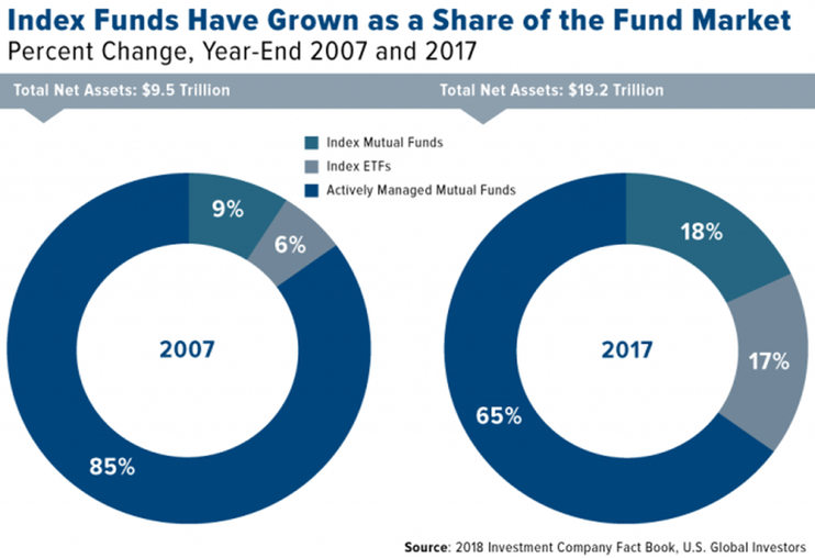 Index funds refer to a mutual fund or Exchange Traded Fund (ETF) that track a specified basket of underlying securities (tradable financial assets). Moreover, ETFs are becoming an increasingly popular investment vehicle amongst both retail and institutional investors. More than 4,500 ETFs managed over 4.46 trillion USD worth of assets in 2017. ETFs, in essence, are securities that are listed on stock exchanges and can be traded just like stocks. An ETF tracks a basket of securities that could range from indexes, stocks, bonds, to even commodities. Popular ETFs include the SPDR S&P 500 ETF (SPY) that tracks the S&P500 Index, Vanguard Total Stock Market ETF (VTI) that tracks the market-capitalisation weighted index of the entire U.S. equities market, and the United States Oil Fund (USO) that tracks the price of West Texas Intermediate (WTI) light, sweet crude oil.