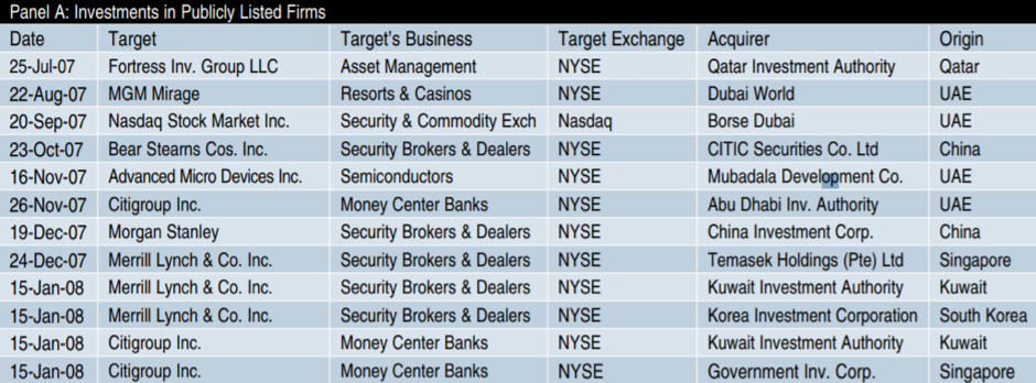Apart from Norway and Singapore, several large SWFs have been facing scrutiny, particularly funds from the Middle East, scoring an average of 5 on the transparency index. The lack of transparency in these funds’ sizes and objectives, coupled with close links to their governments, have led to speculations of politically motivated investments. SWFs can clandestinely acquire strategic assets of another country, stealing proprietary information, patented technology and trade secrets. The bailout of major U.S financial firms during the global financial crises of 2007-2008 by Asian and Middle Eastern SWFs and the subsequent poor performance from these investments increased debate on investment strategies and put pressure on managers to avoid further losses.