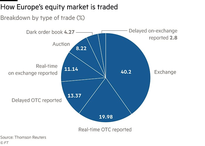 Due to the large orders, exchanges are concerned about the volume of trading being drawn away from regular exchanges, resulting in lesser fees for exchanges and lower activity for the wider market. According to Thomson Reuters, over 45% of daily traded volume in Europe occurs in off-exchange platforms like dark pools. With secretive deals the public is deprived of knowledge and are less empowered to make informed investment decisions, which breaks down the trust of public investors. Subject to less reliable prices and lower liquidity, it seems unfair for institutional investors to profit from a separate platform at the expense of the public.