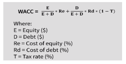 The WACC is given by the formula below – i.e. it is a weighted average between the cost of equity and tax-adjusted cost of debt.