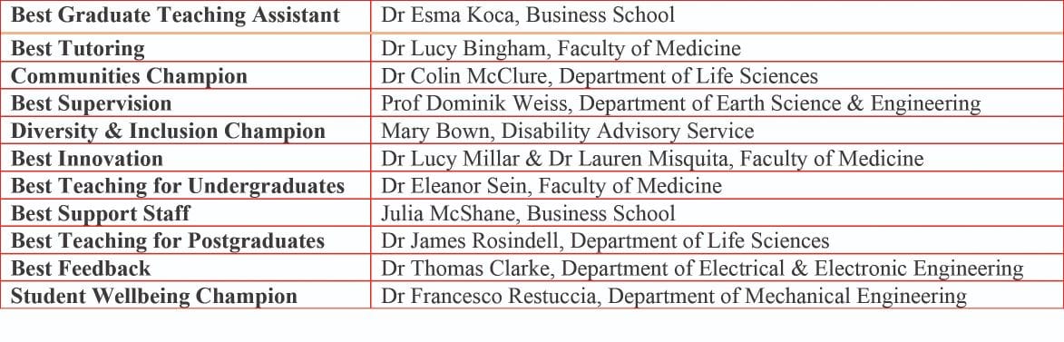 - Student Wellbeing Champion - to reward "staff who are proactive in enhancing the wellbeing of their students by making student wellbeing a clear priority, being proactive in their approach to tackle wellbeing issues, and providing effective advice, support and guidance to help students take care of themselves."