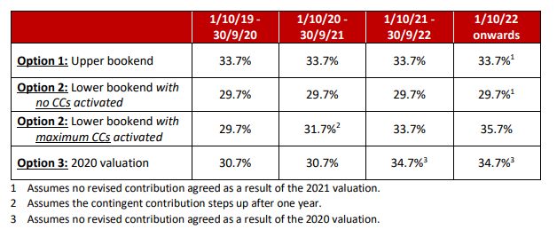 The “lower bookend” approach would set contributions at 20.4% from employers and 9.3% from staff for a total of 29.7%. However, this approach is dependent on being able to guarantee that extra “contingent contributions” would be available in the event of an economic downturn. This is to ensure that the recovery of the USS’ deficit (£3.6 billion as of March 2018) is not hampered. However, this approach would require further negotiations, which would not be completed until summer 2020. This means the planned increases in October 2019 and April 2020 would still go ahead.