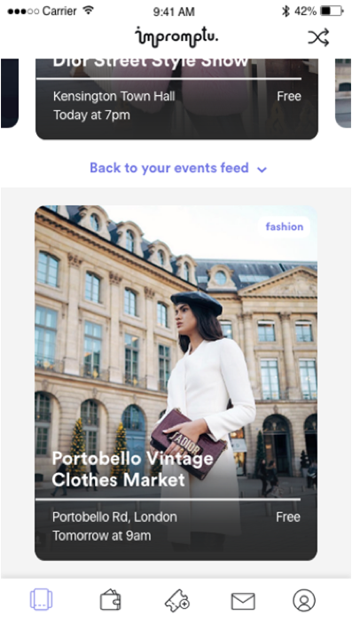 Practical examples of Impromptu’s use might entail coming out of work with the evening free and no plans in place. A simple browse of the user interface will provide a host of interesting options. One might find someone keen on playing tennis and needing a partner, a group of girls looking for another to join them for a movie, a tourist in town looking for a local to share a drink with, or perhaps, even a group of friends happy for others to join them watching the football. Furthermore, the nature of Impromptu will benefit amateur promoters, university societies and charities (think recruiting people to food drives etc.)
