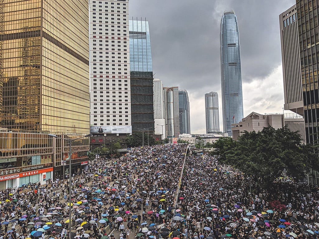 Above: a protest in Hong Kong at a more peaceful time, as opposed to the violent protests occurring at time of publication