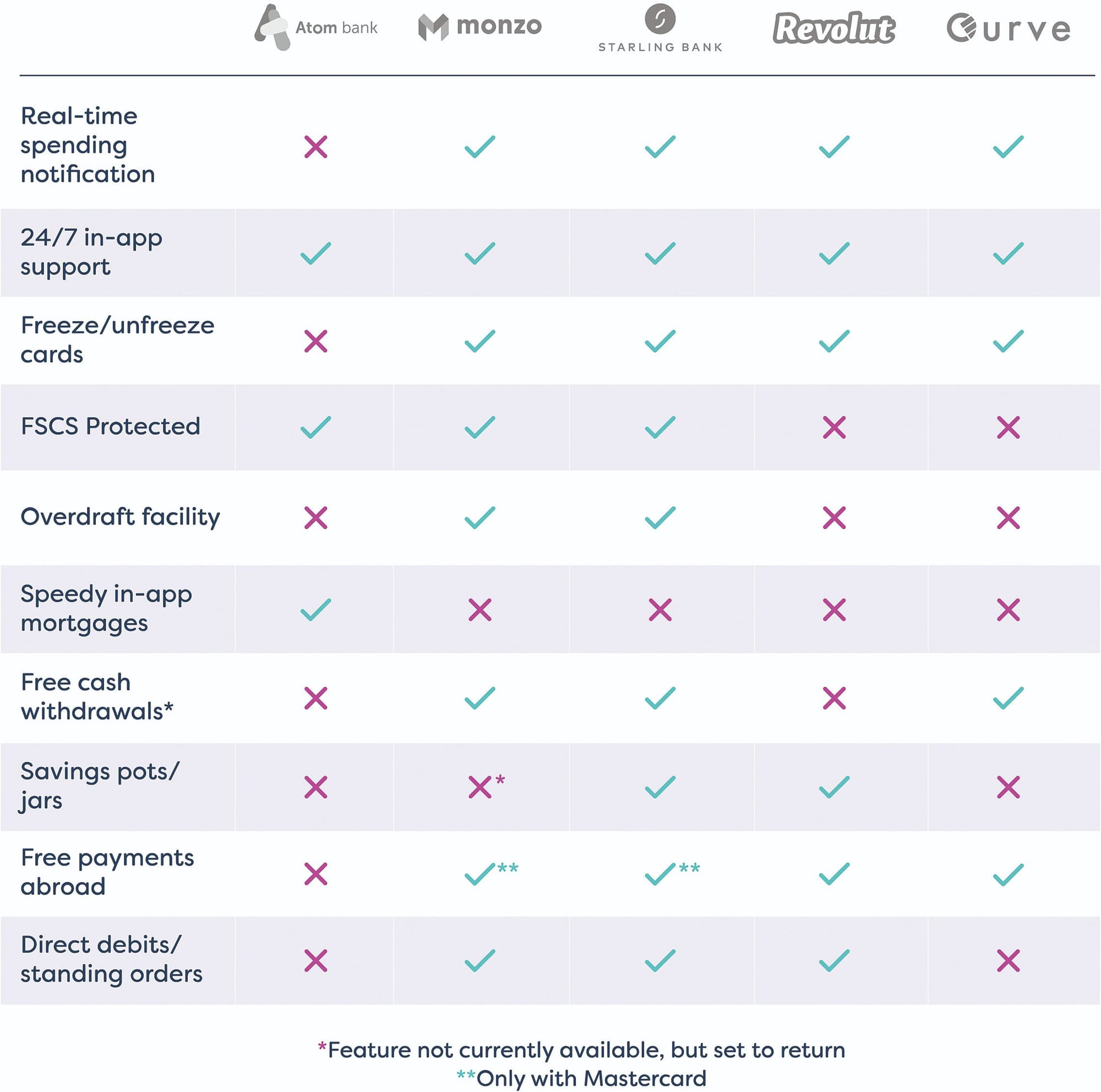 Over time, most of these challenger banks seek to emulate their traditional competitors as closely as possible. However, the way they have started their businesses has been different as they have sought to target their applications towards specific audiences. On one hand, there are those which shine in international money transfers. They can be used in hundreds of different currencies and at a significantly reduced cost compared to high-street banks. Revolut has been one of the most prominent in this area. It charges no extra fees for global money transfers and spending abroad and also uses the Interbank Exchange Rate, which helps save consumers even more. The Interbank Exchange Rate is the rate used by two banks to transfer capital between themselves. Banks tend to charge a fee on top of the rate used to make the exchange, a trend that Revolut has decided not to embrace for transactions between Monday and Friday, when the currency markets are open. On the other hand, there also exist those focused on a more conventional banking experience, such as Starling. This kind of upstart institutions offer a current account and usually, though not always, pay interest on their customers’ balance. The list of services available typically includes overdraft; challenger banks clearly state what fees they will charge for using their overdraft feature. In March 2017, Starling launched the UK’s first app-based current account. Monzo and Berlin-based N26 soon followed suit. Another UK company, Monese, can appeal to foreign nationals and freelancers because it aims to remove as many obstacles as possible from the account set-up process. It lets people create a bank account without needing to provide a permanent UK address. Figure 2 offers insight into the features offered by the digital-only firms currently active in the digital bank space. financial services sector. The figure demonstrates that certain companies, such as Revolut and Curve, specialise in international transactions, while Starling, Monzo and Atom Bank, among others, emulate the functionality of their domestic competition.
