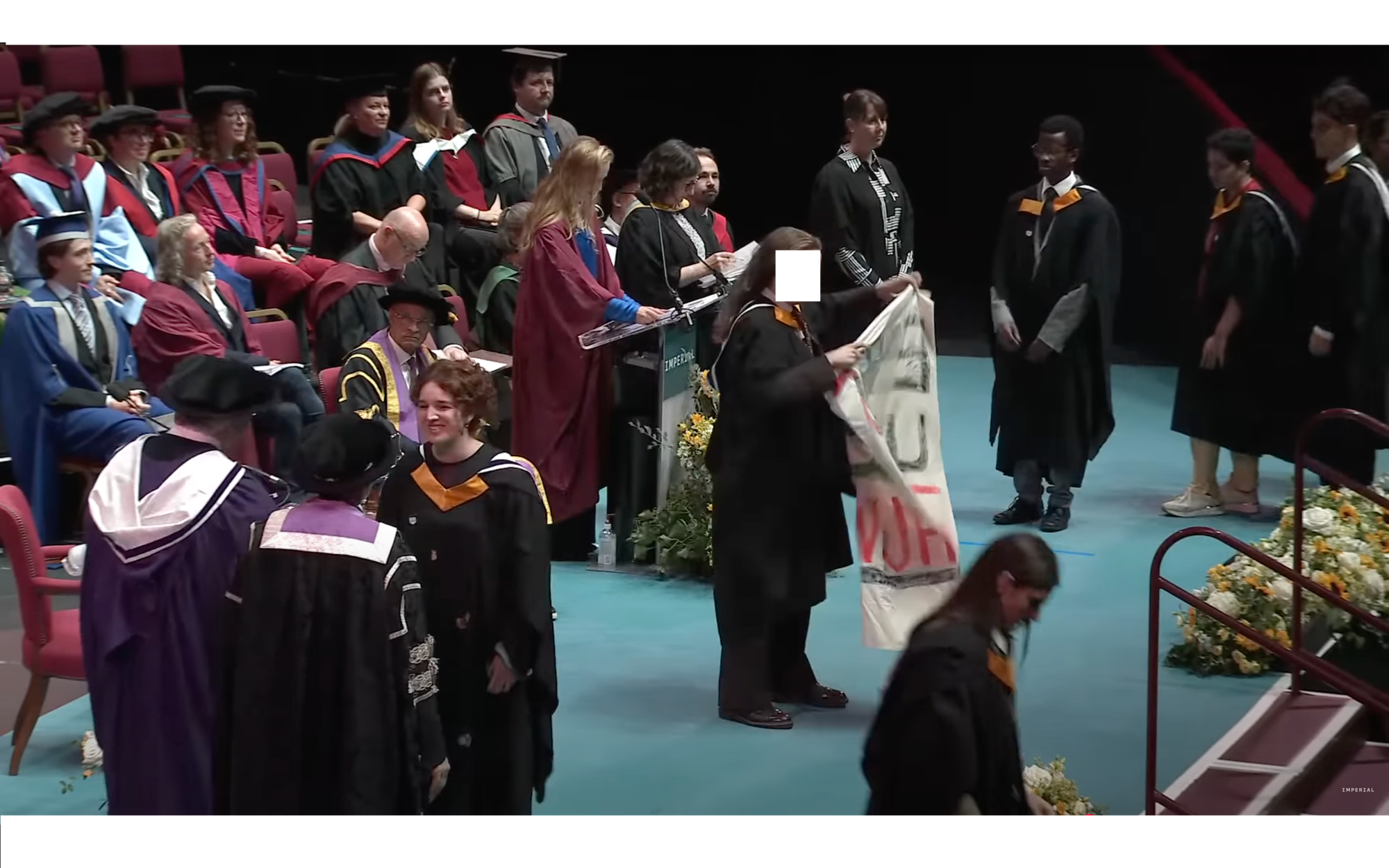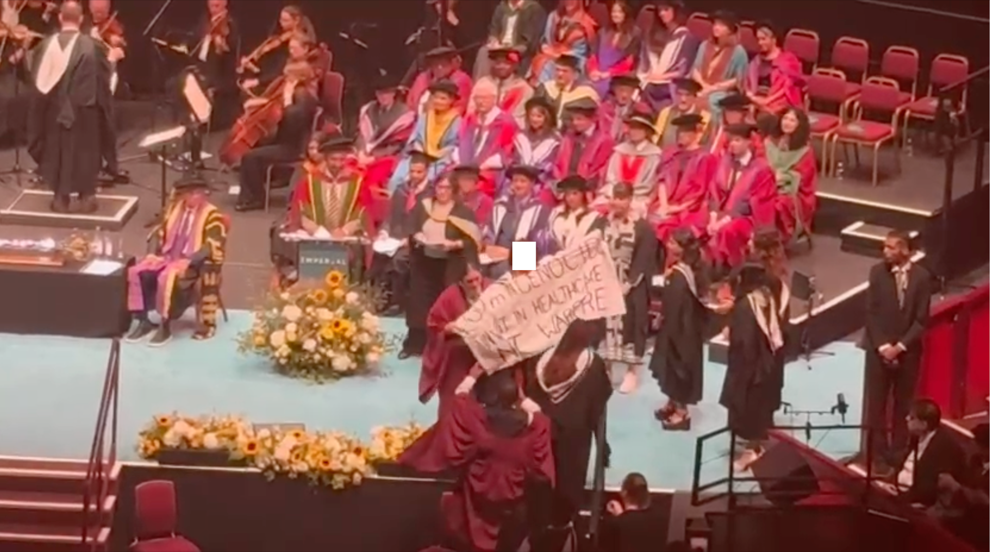 As they prepared to walk along the stage, the first graduand unfolded and held out a banner that read “£60m in genocide, invest in healthcare not warfare.” A security officer clasped the graduand and led them offstage, whilst another snatched the banner away.
