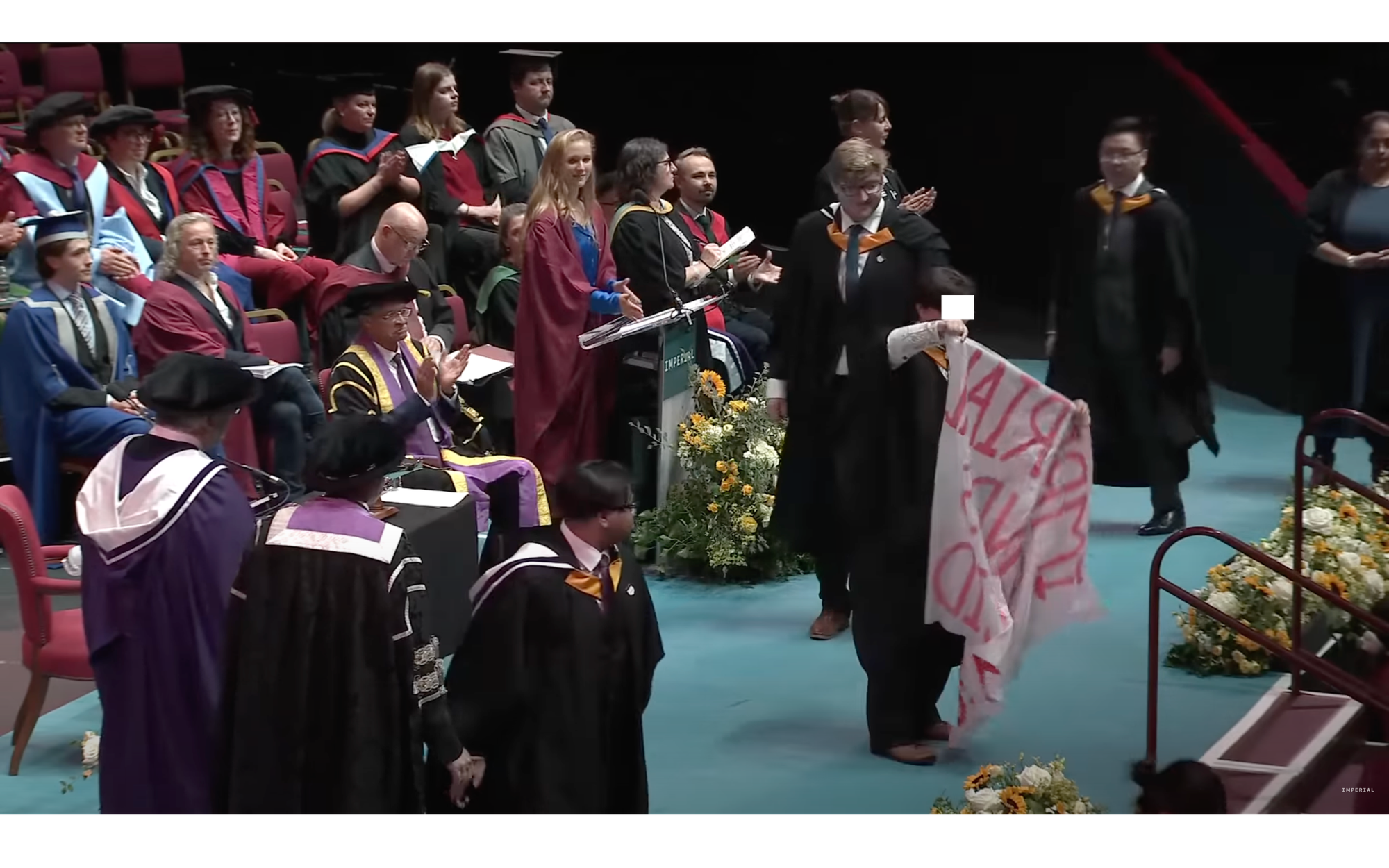 Three graduands displayed banners condemning the alleged involvement of Imperial in the humanitarian crisis in Gaza during the graduation ceremony of Commemoration Day, on Wednesday 8th October.