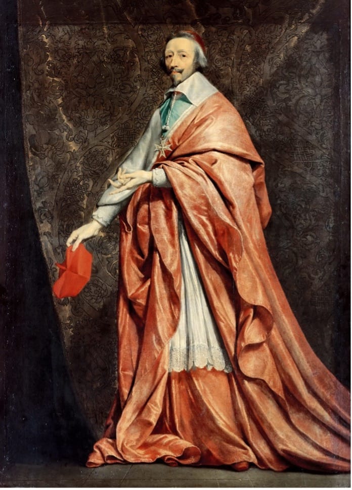 This master work by French artist Philippe de Champaigne is a departure from the usual norms of episcopal portraits. Conventionally, religious figures are always depicted seated in their episcopal chairs as a sign of their religious authority. Here, the titanic figure of Cardinal Richelieu is shown standing, and it’s worth noting that famously Richelieu was not only a religious figure, but a shrewd diplomat and statesman (as shown negatively in Alexandre Dumas’ The Three Musketeers); figures of state were often portrayed in a standing position rather than seated. This dual life of the cardinal statesman is further exemplified by the cardinal’s lose red robes, revealing his blue medal of state. It may be a coincidence, but one can always identify a portrait by Champaigne by his use of both red and blue in clothing, showing his mastery in the use of contrasting colour to give his subjects depth and character. Richelieu here is also depicted holding his biretta in his right hand while offering an open outstretched left hand, indicating his dedication to religious practice, but offering his other hand as a sign of diplomatic openness.