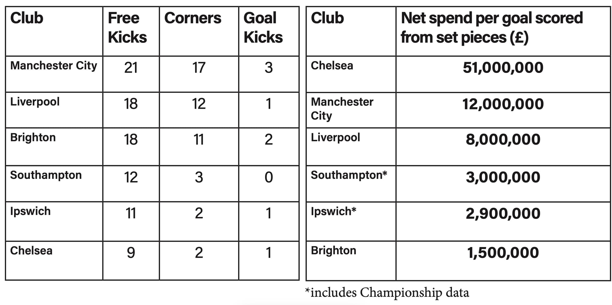 Chelsea’s decision to target Brighton’s expertise becomes clearer when examining the numbers behind long term set-piece success. Felix has compiled a table ranking a selection of relevant clubs by the number of goals arising from set pieces, to highlight the results of this theoretical football approach. To further contextualise these numbers, we have also provided the net spending per goal scored from set pieces over the 20/21-23/24 seasons in GBP.