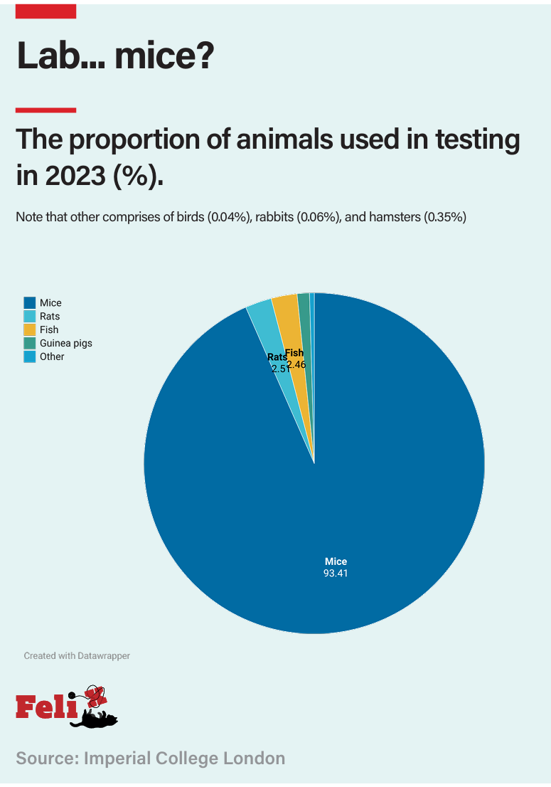 “These animals suffer immense pain,” said a protester through a megaphone. “They fight for their lives. These animals want to live.” 68,135 animals were used in research at Imperial in 2023. 60,850 were used in “scientific procedures”, with 7,555 animals used for “breeding or tissue collection purposes”. The vast majority of animals used were mice, accounting for 93.41% of all animals involved in animal testing in 2023.