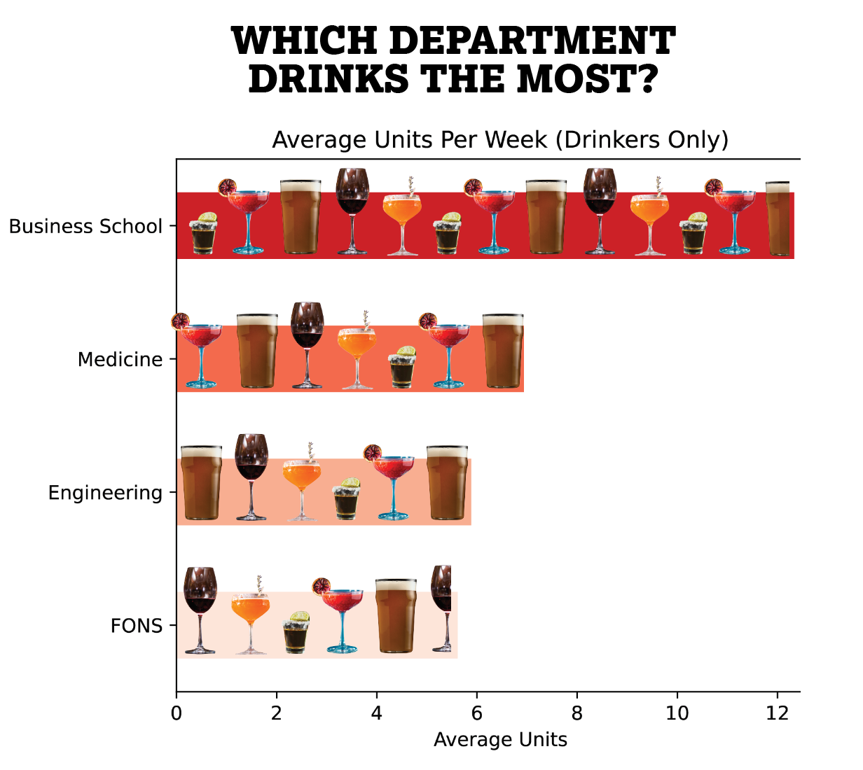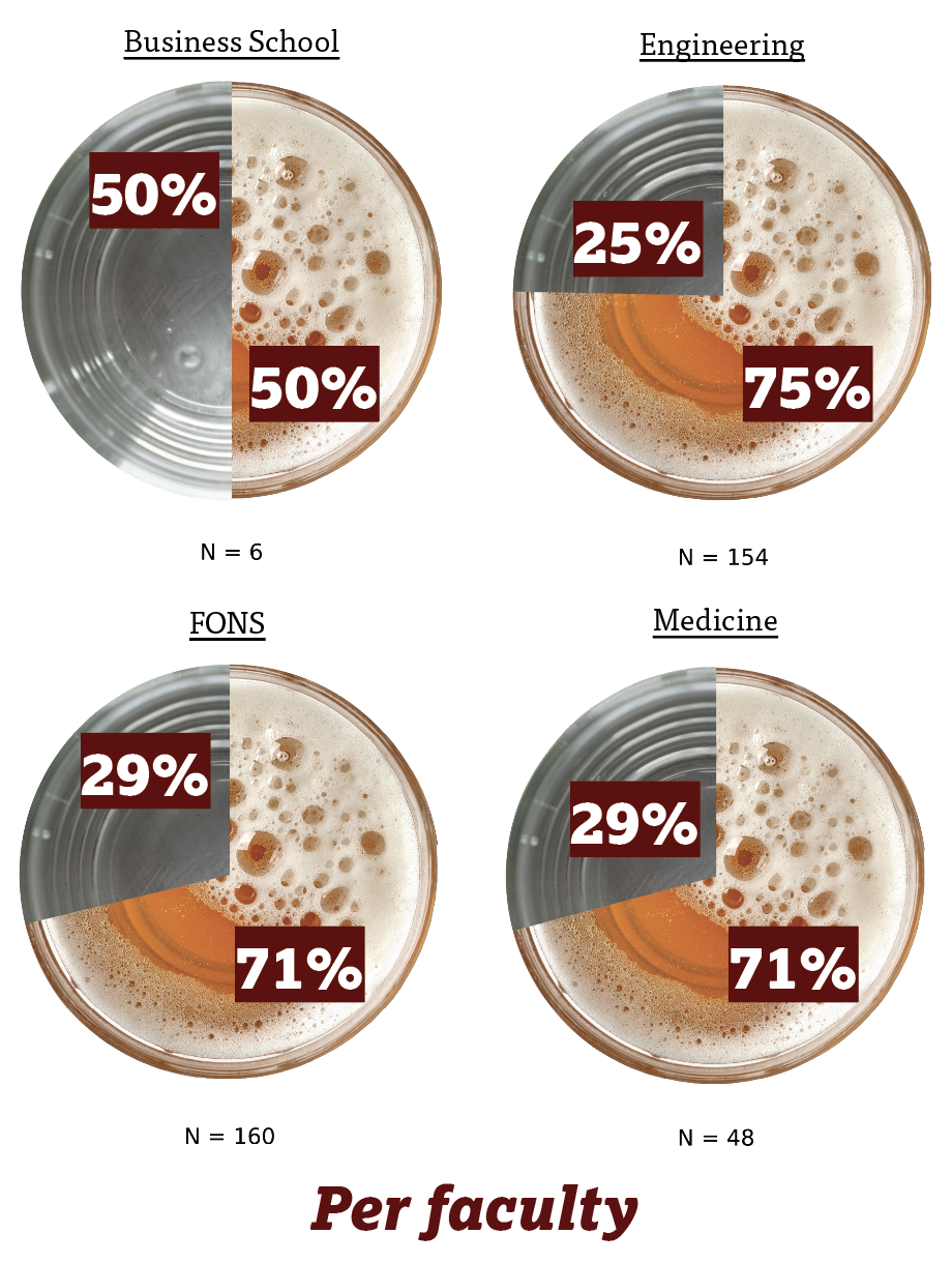 The faculty of engineering had the highest proportion of drinkers. However, among those who drink within faculties, Business School students and medics have the most weekly drinks, although the sample size for Business School respondents is too small to really be meaningful. The good news is that, on average, no faculty’s boozer community exceeds the maximum intake recommended by the NHS, which stands at 14 drinks per week.
