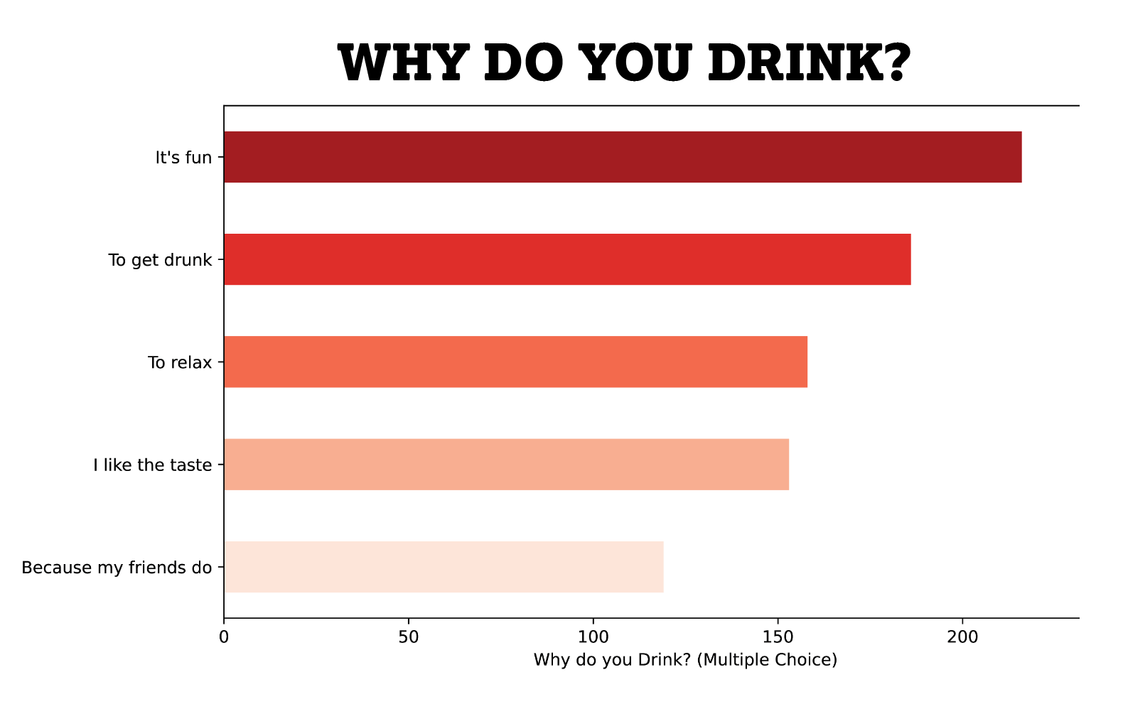 The most common reason given for drinking was “it’s fun”, followed by “to get drunk”. Luckily, peer pressure is a less important factor for students, with “because my friends do” being the least chosen reason for drinking. However, some more concerning free-text answers included “addiction”, “to drown my sorrows”, and “to bare [sic] social interaction”.