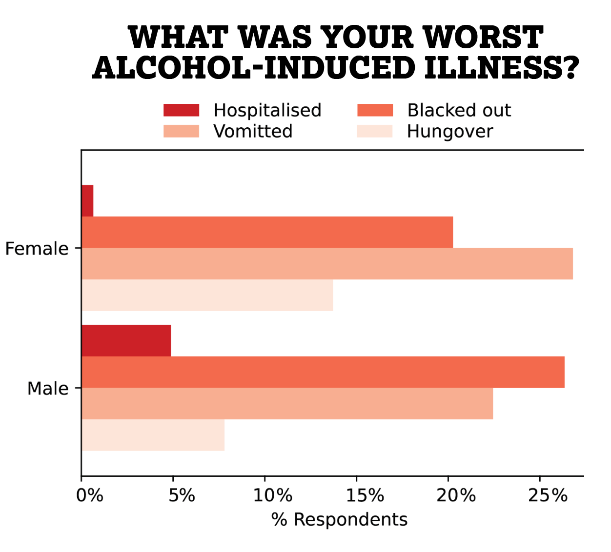 Females were less likely to have been ill from drinking than males, and those who had reported less serious degrees of illness. (Data from non-binary respondents was excluded because the sample was too small to be significant.) Throwing up was the worst degree of illness that the most women reported, compared to blacking out for men.
