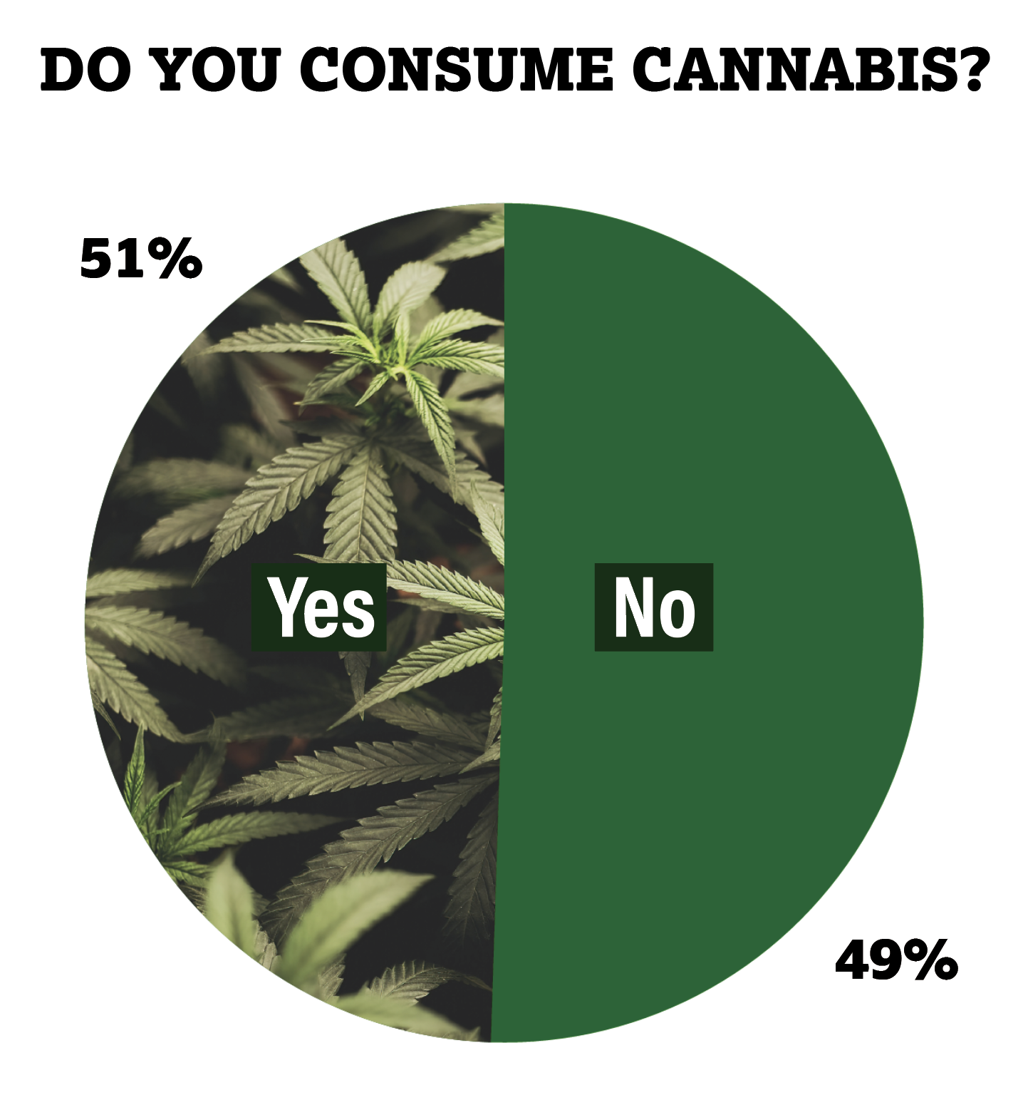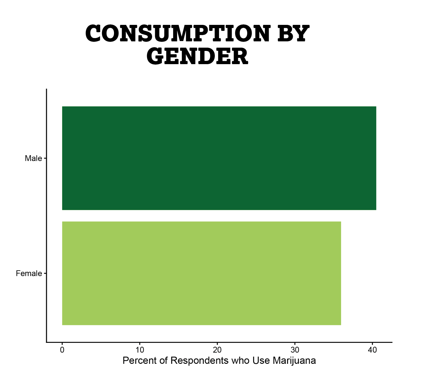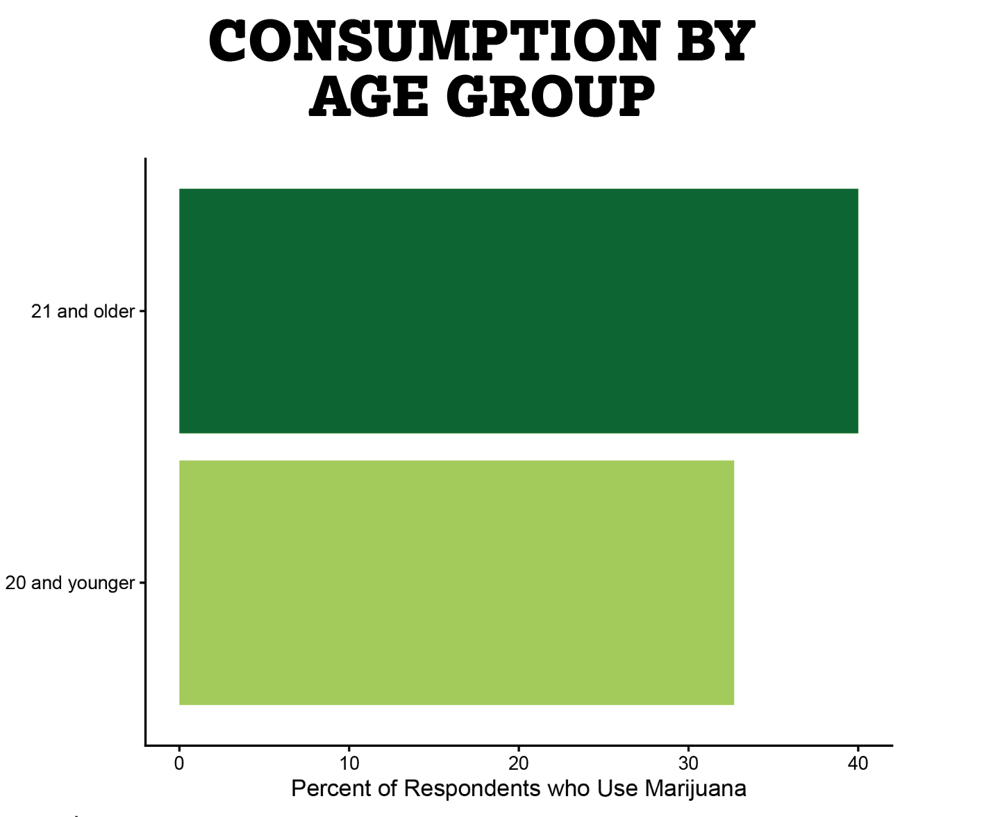 A slightly higher share of men use cannabis compared to women (data from non-binary respondents was excluded because the sample was too small to be significant), and consumption is more widespread in respondents over the age of 20.