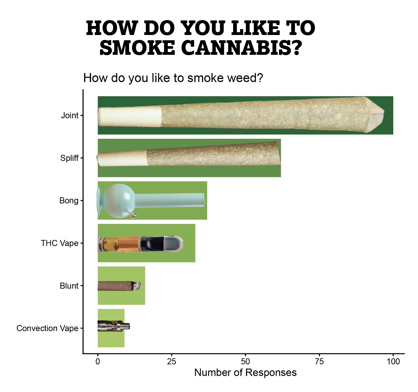Ways of smoking weed were ranked by 125 repondents. Joints (pure cannabis in cigarette paper) came out on top, followed by spliffs (which unlike joints contain a mix of tobacco and cannabis). As for edible cannabis, brownies (74 answers) and gummies (52 answers) were the most popular foods.