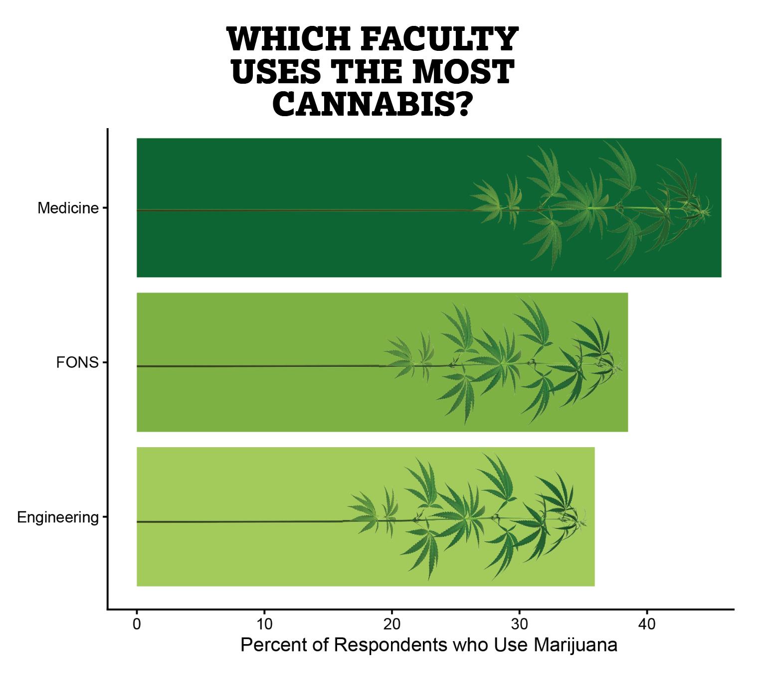 Students from the Faculty of Medicine were found to use the most cannabis (48 respondents), followed by those from the Faculty of Natural Sciences (161 respondents), while relative usage is lowest within the Faculty of Engineering (156 respondents). The Business School was excluded because of a lack of responses.