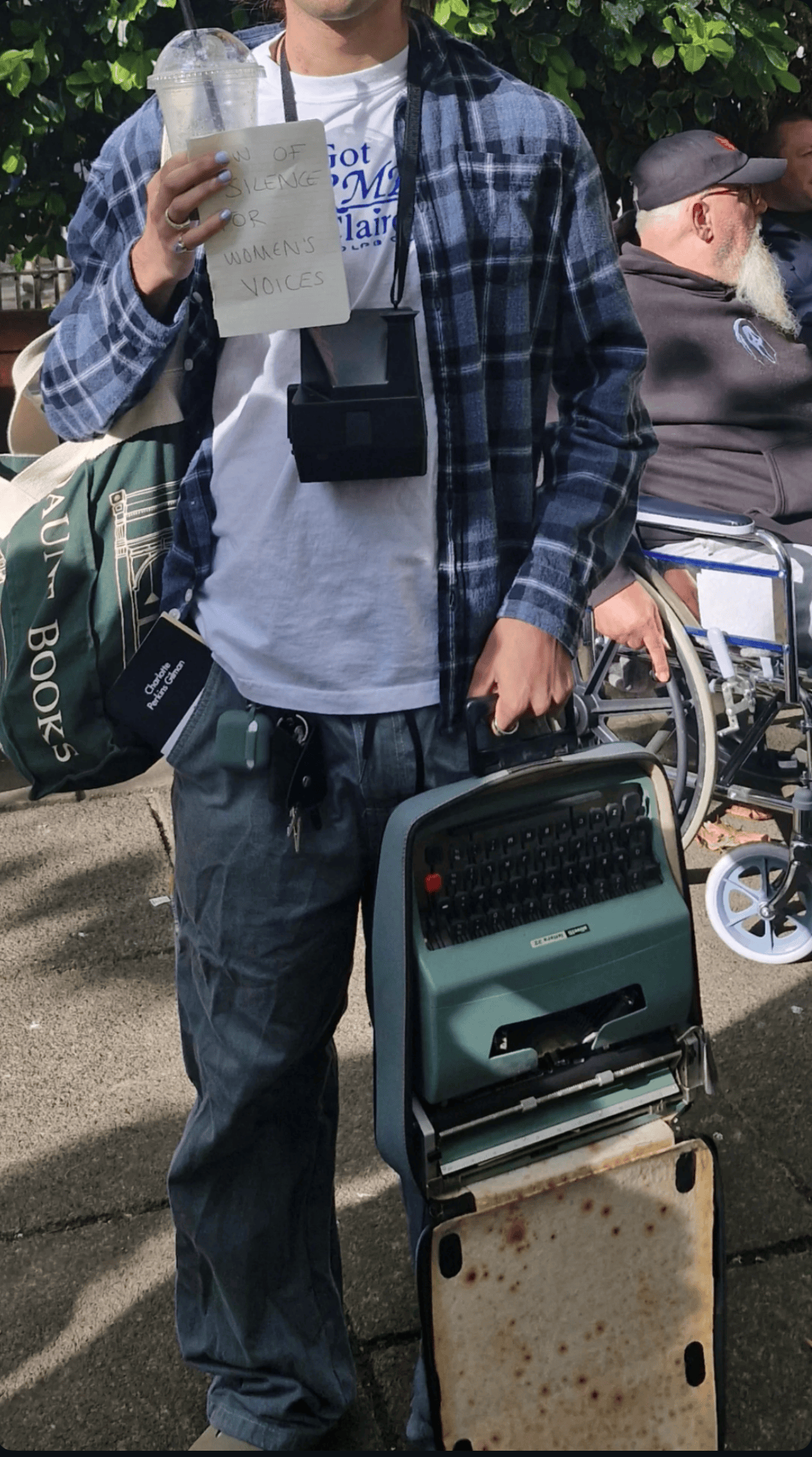 One of my close friends, who is extremely competitive, and self-describes as a performative male herself, decided we needed to lock in for this. In essence, I was going to perform this time, by caricaturing myself. We didn’t even need to buy anything specifically for the competition either, instead collating our own items to put in my trusty Daunt Books tote bag. I brought several books: Pride and Prejudice, The White Album, and Porn: An Oral History, which may sound like a joke, but is actually a Nell Dunneque discussion with different people about the social and sexual context in which porn operates in their lives (see, I’m good at this). My friend brought Ariel by Plath, The Yellow Wall-Paper, and Flush by Woolf. To add to my costume, I brought my two sage green notebooks, my planner, my friend’s red notebook, some third wave coffee, my Hario coffee grinder and AeroPress, my Polaroid 600, and my friend’s Olivetti Lettera 32 vintage typewriter. And also, my tobacco, menthol filters (because I’m a sensitive young man who cannot bear the taste of regular tobacco), and random bits and bobs I always have, like a carabiner. I used to have a Vivienne Westwood orb carabiner, but that unfortunately broke in a random act of tomfoolery. Go big or go home was our ethos, and we knew we had a winning candidate in myself.