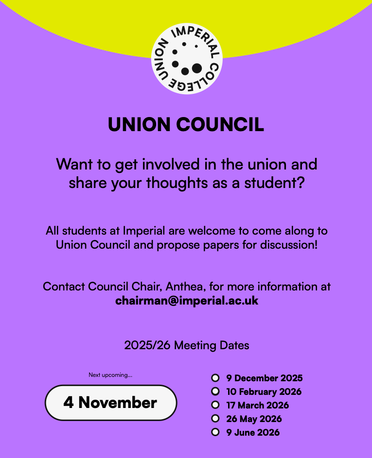 The Union Council consists of most of Imperial’s elected student representatives, assembled to set the set the policy of Imperial College Union. It provides oversight of the Union’s activities and keeps it accountable.