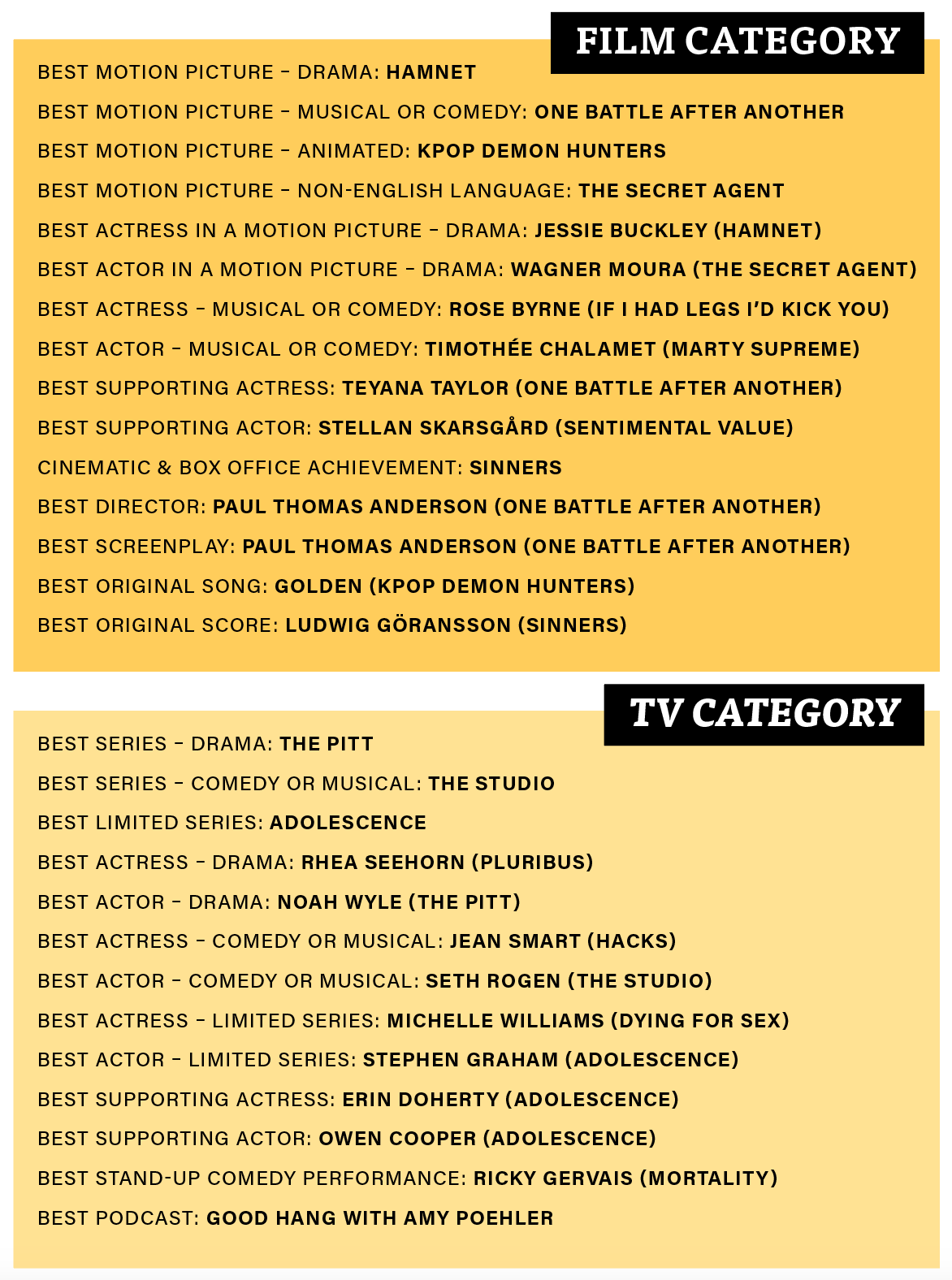 This year’s Globes introduced a Best Podcast category, won by Good Hang with Amy Poehler, acknowledging the medium’s growing cultural impact. As awards season continues, the ripple effects of the Golden Globes, in momentum and narrative framing, will be felt in upcoming Critics Choice, SAG, BAFTA, and Academy Awards races. Whether One Battle After Another and Hamnet maintain their hold on nominations remains to be seen, but this year’s Globes have already helped define a richly competitive season.