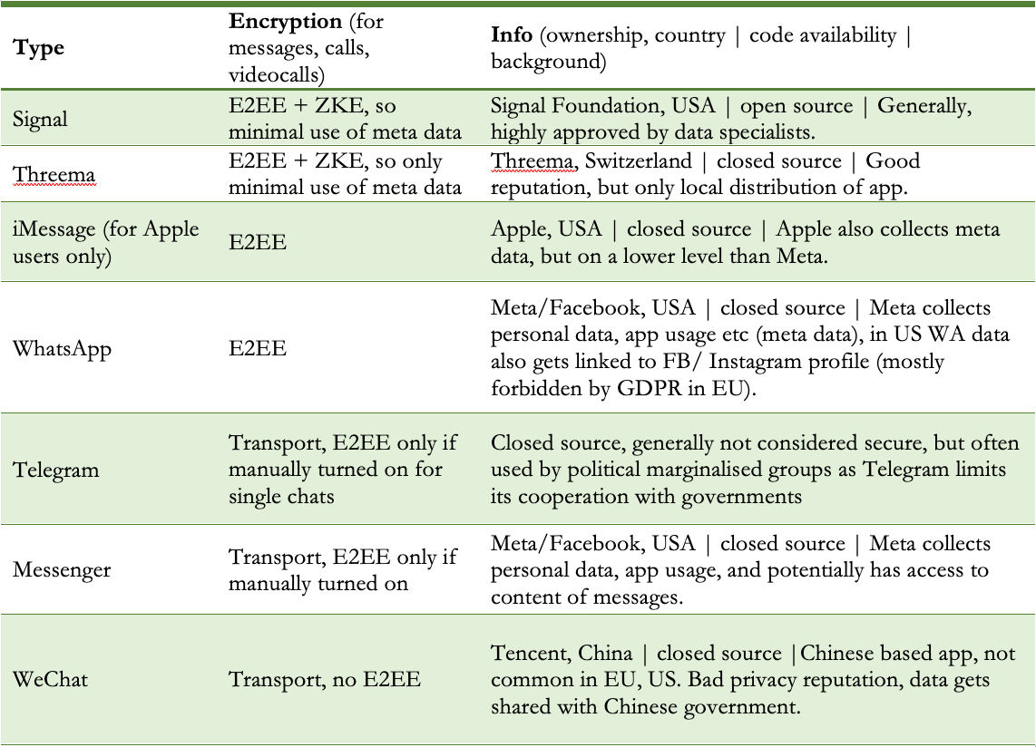 If you can move your frequent communication (for example, with your closest friends and family) from data-hungry apps such as WA and Telegram to alternatives such as Signal (see table below), you can significantly improve the security of your digital life. Organisations like Meta (owner of Facebook and WhatsApp) will no longer have the same access to the meta data from your personal communications.
