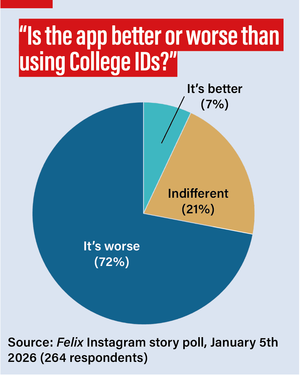 Since its release, however, the app has met significant backlash among students. A poll run on Felix’s Instagram account found that of 264 respondents, 72% found it “worse” than showing College IDs, with 21% of “indifferent” respondents, and only 7% finding it “better”. (Whether all respondents were legitimate users of the app was not verified.)