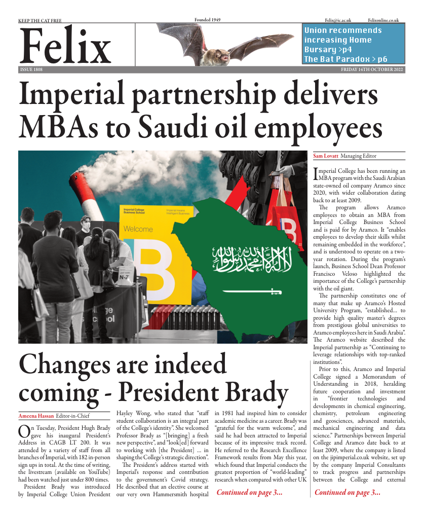 The program allows Aramco employees to obtain an MBA from Imperial College Business School and is paid for by Aramco. It “enables employees to develop their skills whilst remaining embedded in the workforce”, and is understood to operate on a two-year rotation. During the program’s launch, Business School Dean Professor Francisco Veloso highlighted the importance of the College’s partnership with the oil giant.