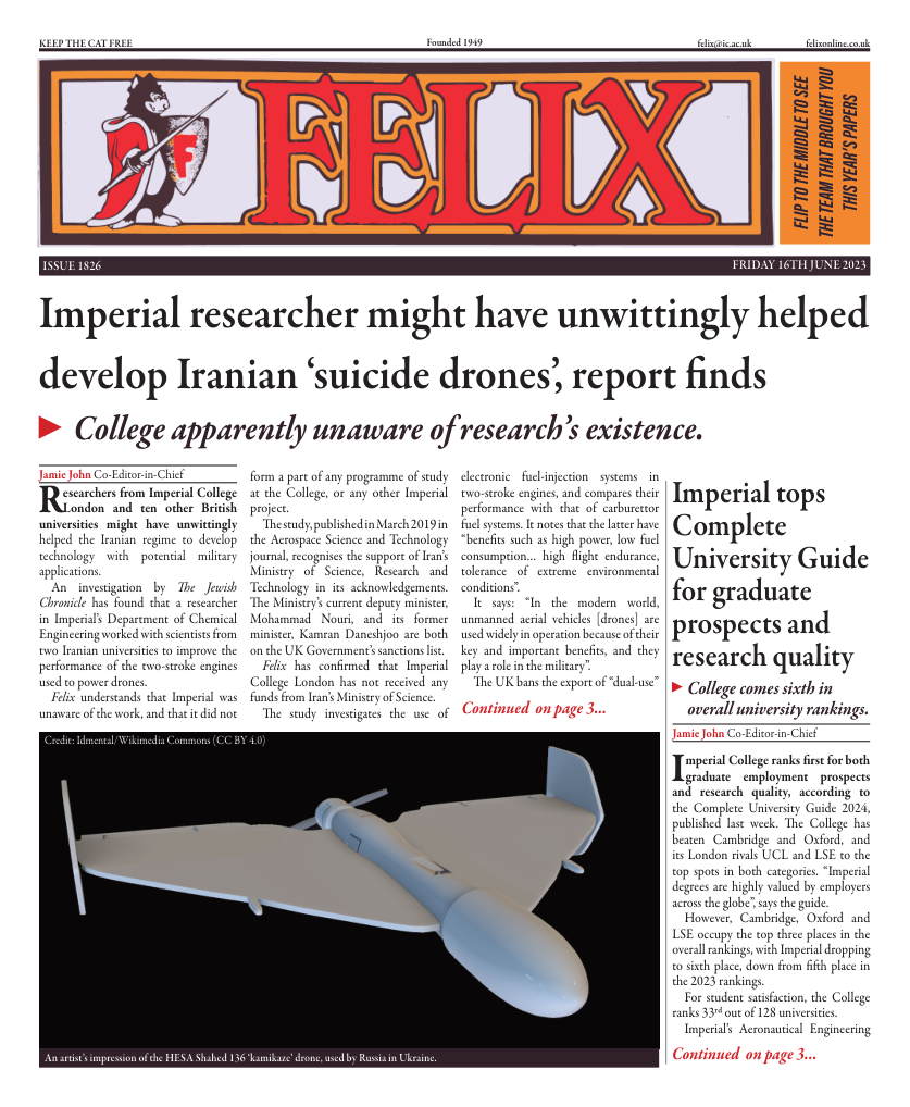 An investigation by The Jewish Chronicle has found that a researcher in Imperial’s Department of Chemical Engineering worked with scientists from two Iranian universities to improve the performance of the two-stroke engines used to power drones.