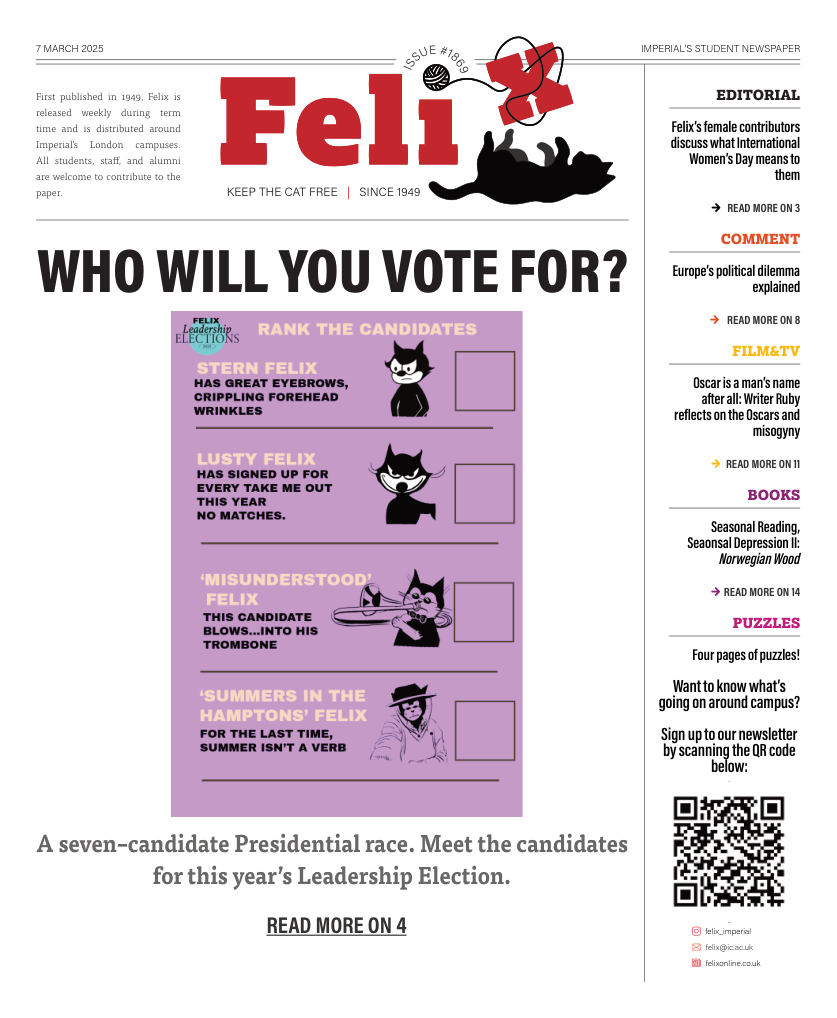 Last year's second place candidate, Poon has returned for another shot at the office. Starting his manifesto with the line "To all subjects of Imperial Corporate London", the manifesto takes aim at Imperial's high international student fees, and "profit and the stockholders" of Imperial. Imperial College like the vast majority of British universities is a public body and thus is not a tradeable stock, nor is it run for profit. Poon's manifesto seems to offer "UROP funding, financial transparency, and even fixed tuition fees" as part of his plan to "DEMOLISH" Imperial's "lies".